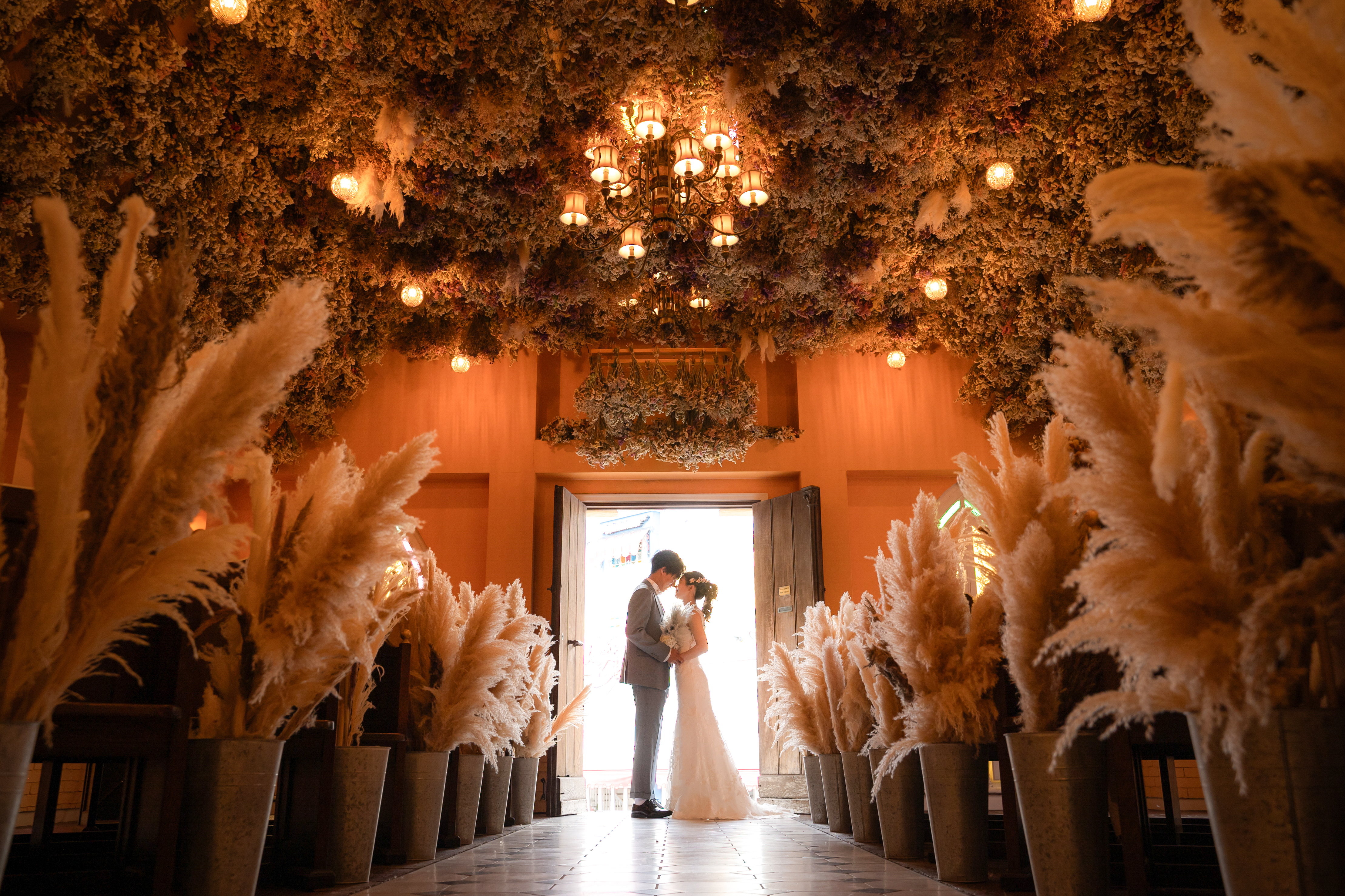 クラシカルなヴァージンロードを包むあたたかな花葉色のチャペル