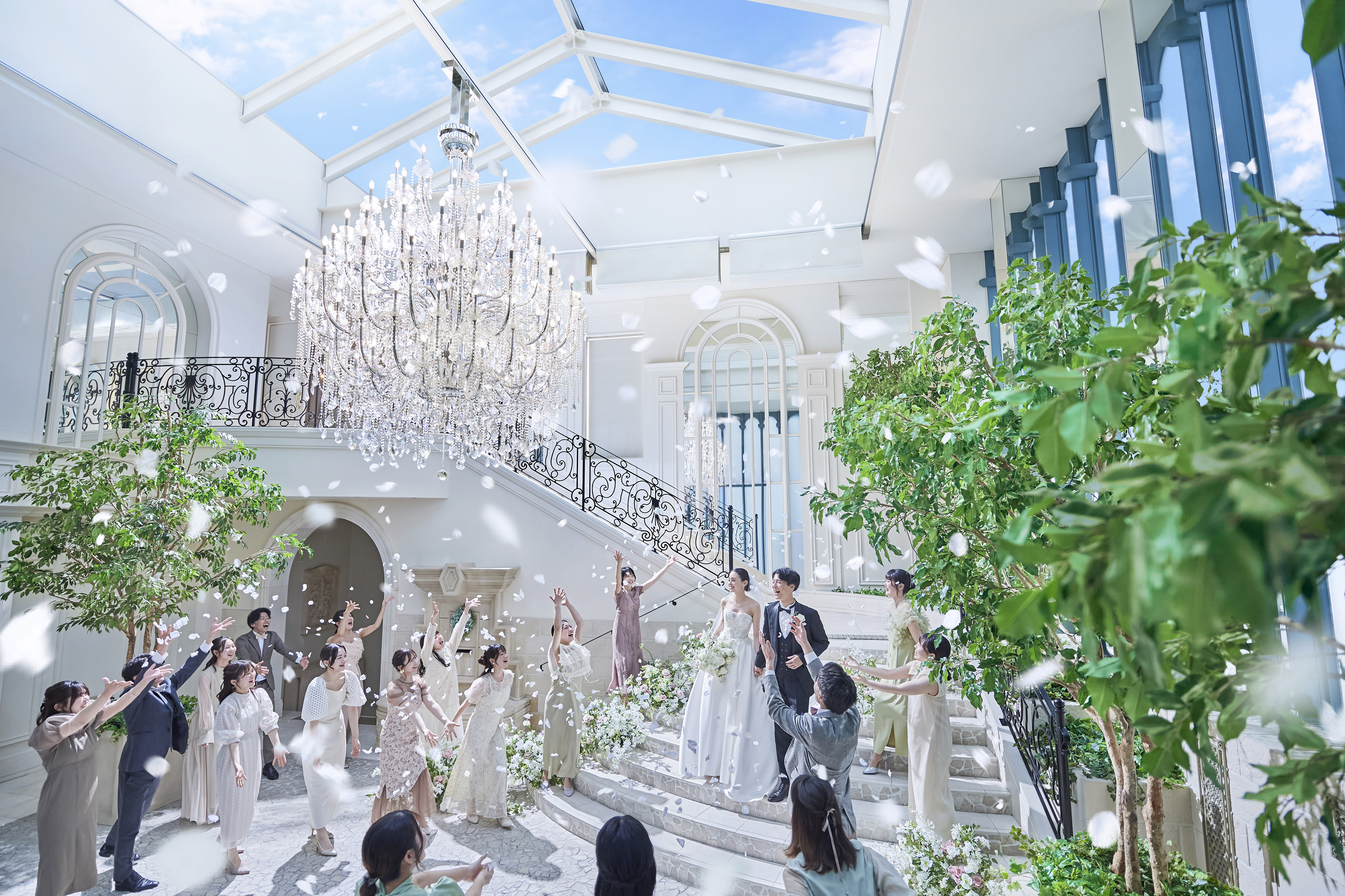 開放感のある大階段で笑顔と喜びが降り注ぐフラワーシャワーを