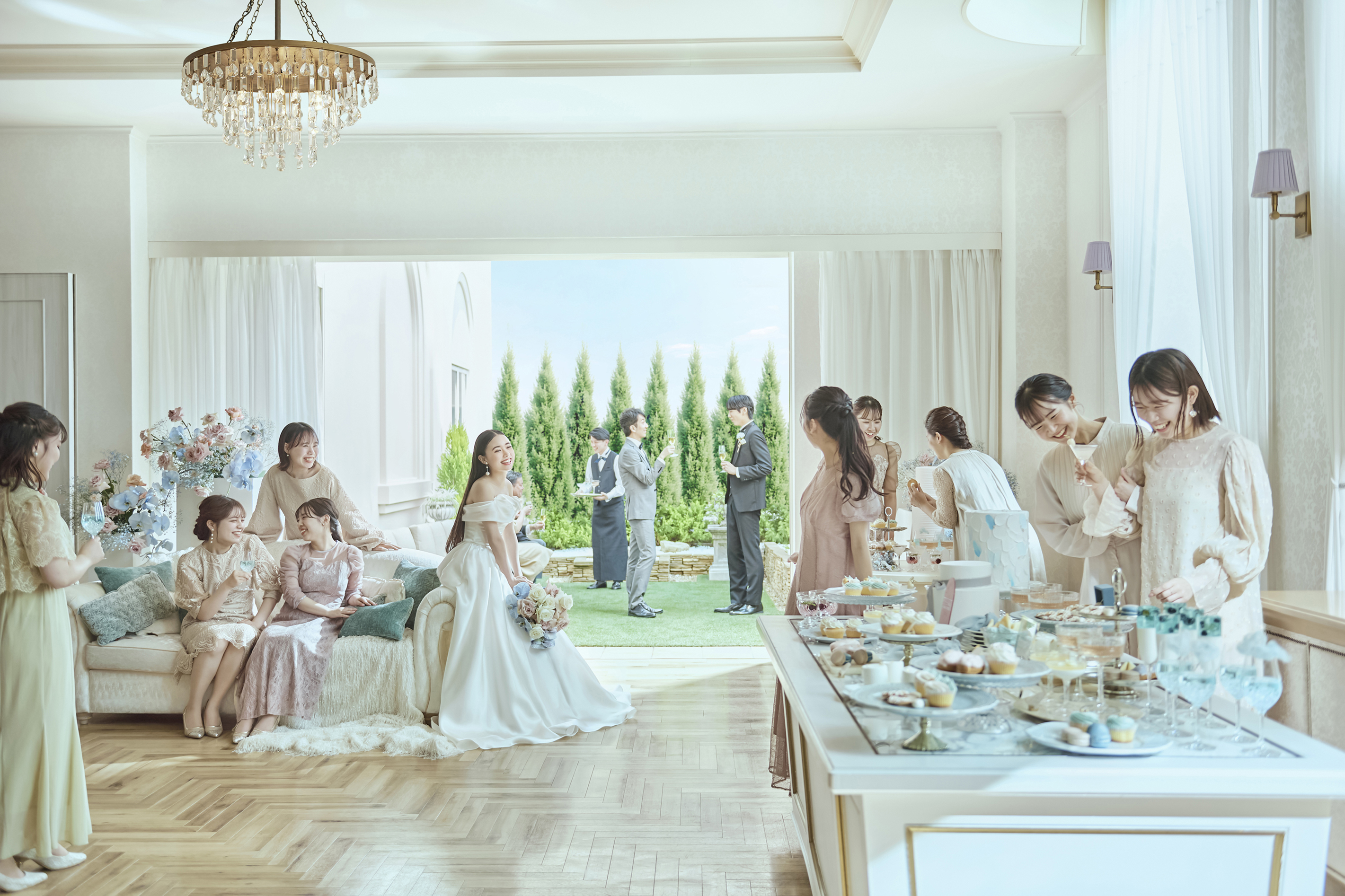 バーカウンターやテラス、フォトブースなど、どの世代のゲストも飽きさせない充実した設備。ドリンクやカナッペを並べてゲストへの+α のおもてなし。