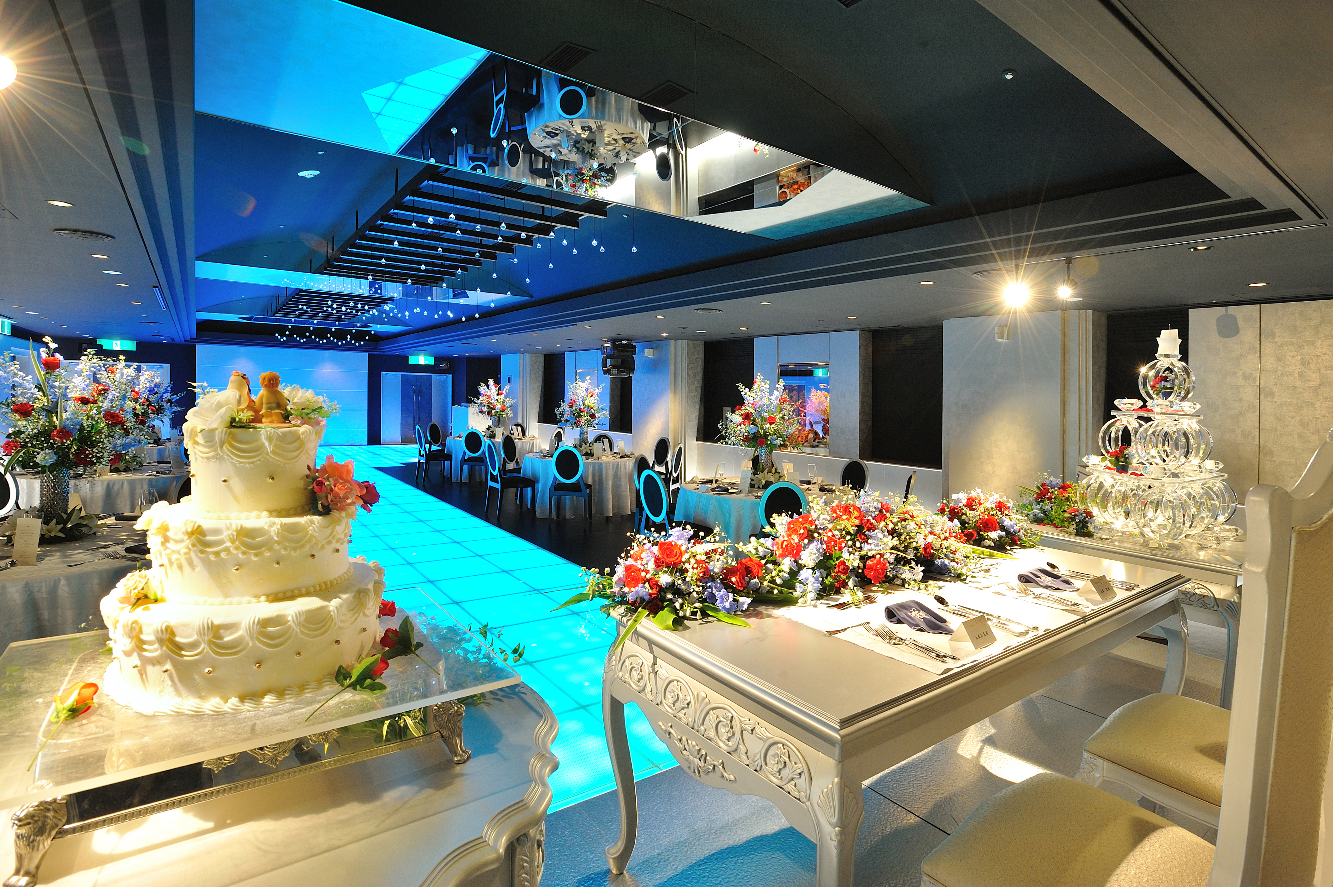 4万個のクリスタルが敷き詰められたガラス張りのバージンロード、ガラス製の透き通ったチャペルベンチ、照明操作が可能な設備で、お二人をより美しく魅せる幻想的なチャペルです。チャペルフラワーを変える事で、いくつにも表情を変えます。