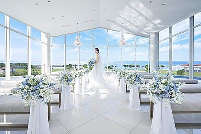 3面ガラス窓から真っ青な空と海が望める開放感抜群のチャペルです。日差しがたっぷり差し込む明るく開放感あふれる空間でアットホームなセレモニーが叶います。
