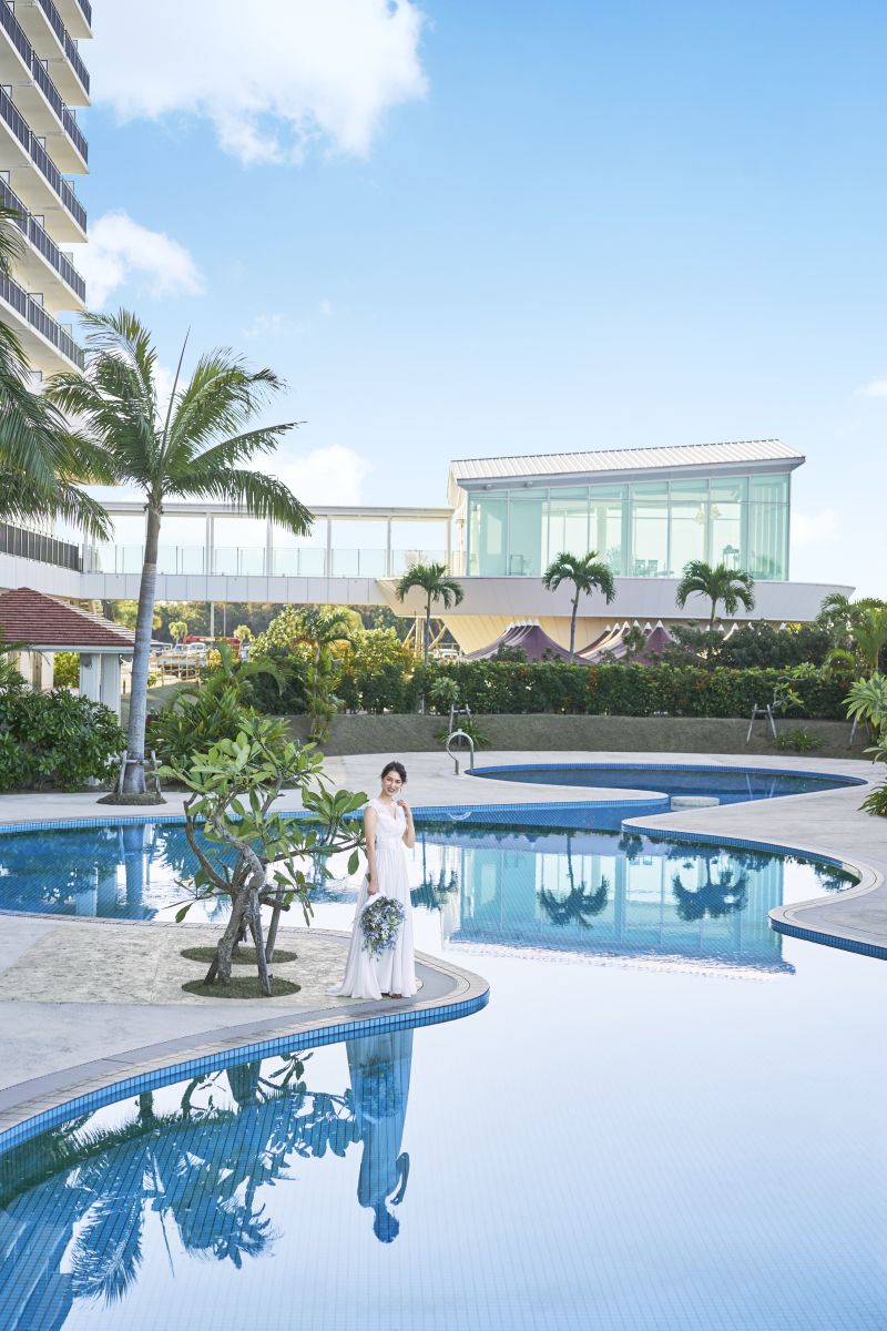 サザンビーチホテル&リゾート沖縄は那覇空港から車で20分の好アクセス。そこに併設されているのが全面ガラス張りのチャペル「シーシェルブルー」。透き通るような青空とまばゆい太陽がおふたりの門出を祝福します。