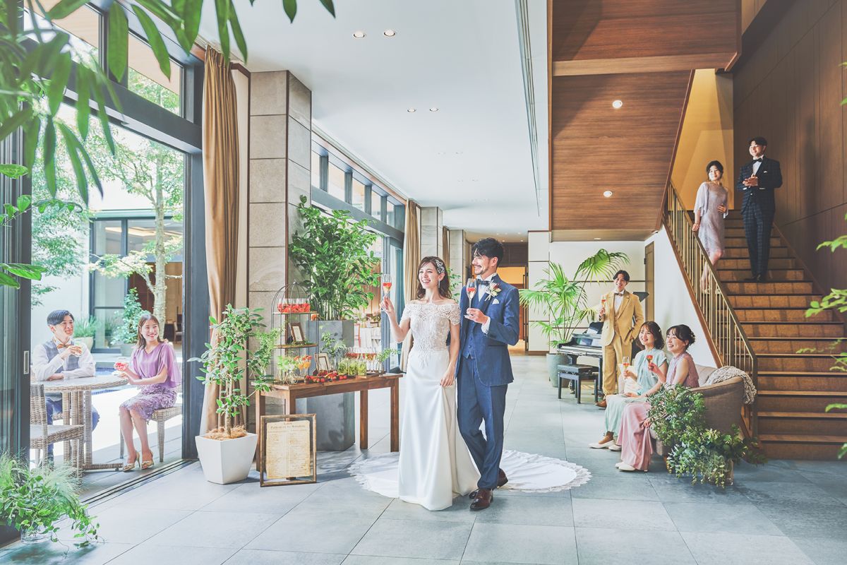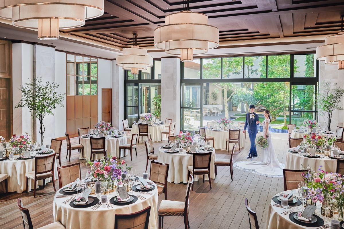 窓一面に緑が広がるパーティ会場も、広く上質なガーデンも1組貸切。天井高7mのチャペルは、ひと目見た瞬間から憧れがあふれます。