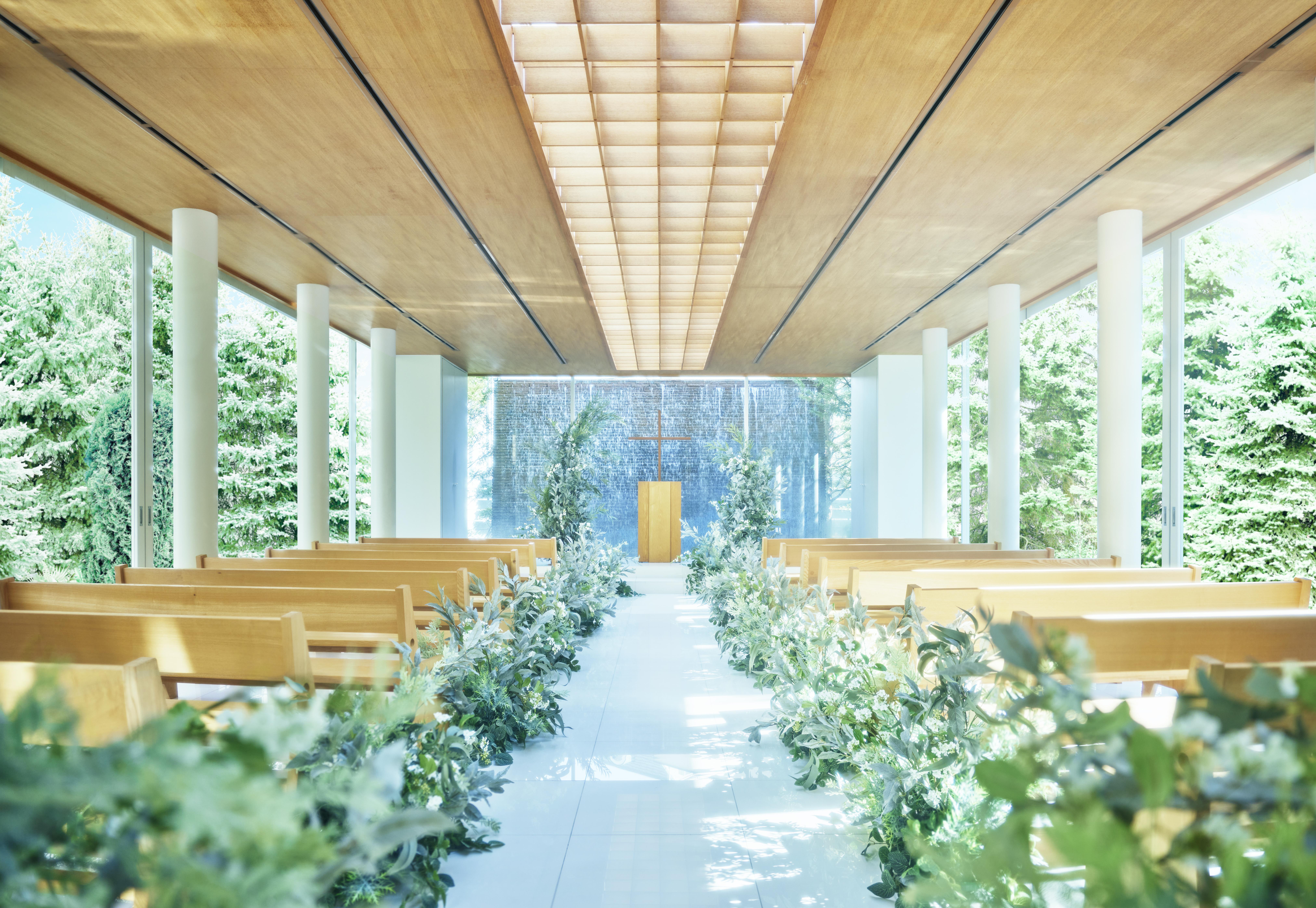 重厚な外観や館内に対し、全面ガラス張りのシンプルな空間。水上に浮かぶように設計されたチャペルは、キラキラと輝く水面の反射が空間内を美しく照らし、天窓を通って注ぐ光が自然光のバージンロードを映し出す。