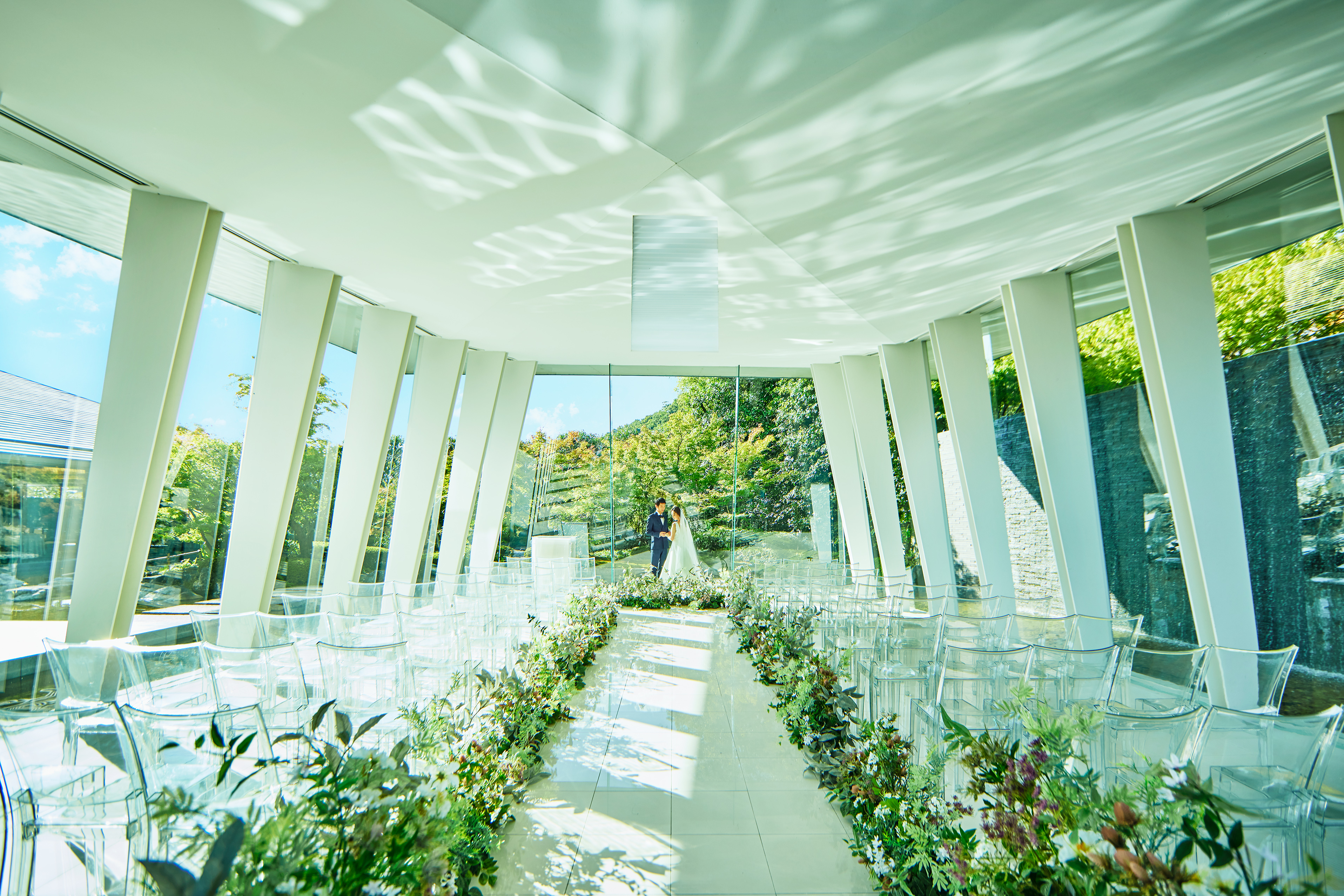 四季によって雰囲気を変える大自然の中に、まるで水面に浮いているよう設計されたこだわりのガラス張りチャペルで永遠を誓います。