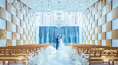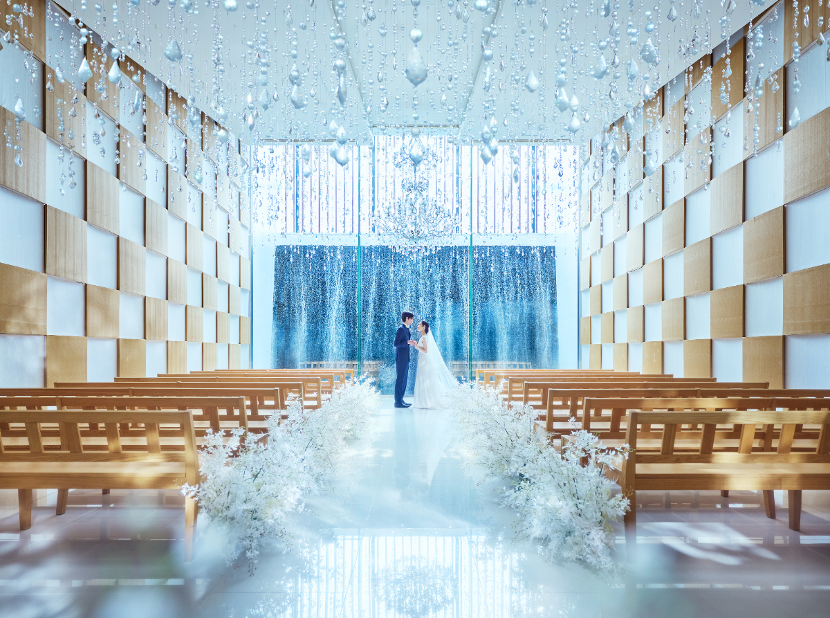 清らかな滝の水しぶきと降り注ぐ自然光がきらめくチャペル
