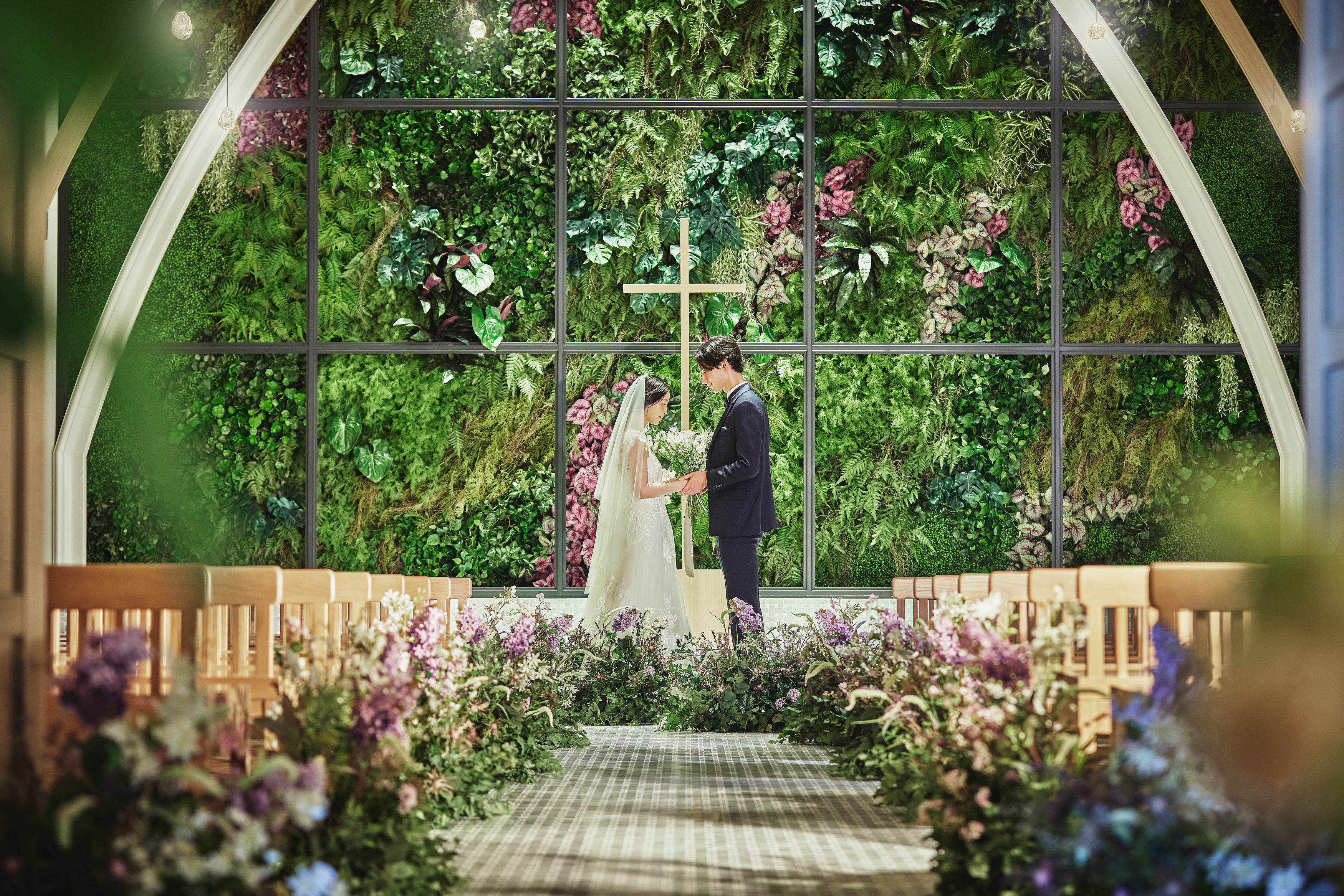祝福の拍手が響き渡る、天井高7mの開放的なチャペル