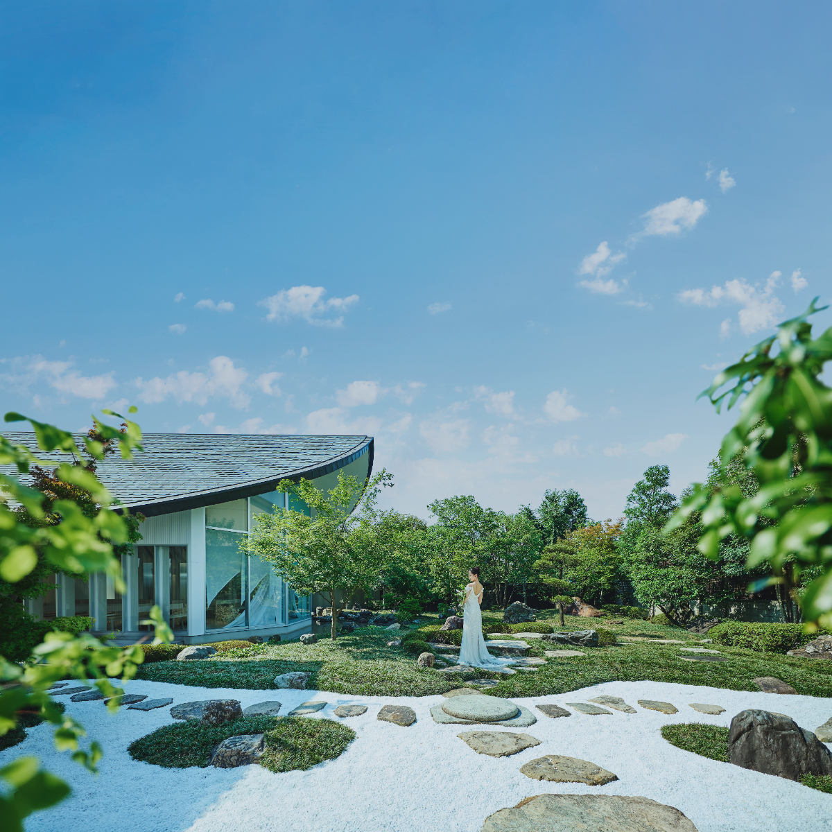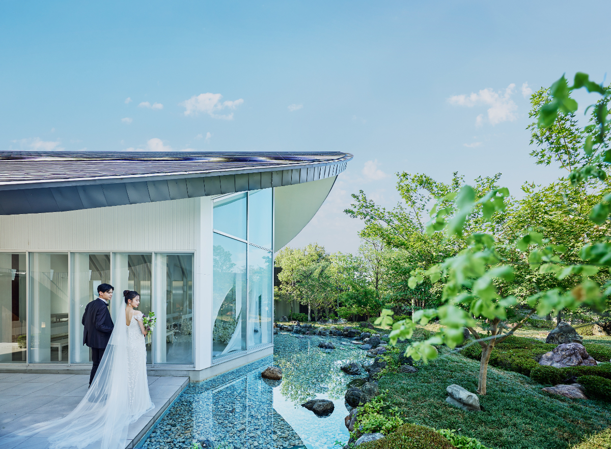 ふたりの背景に四季を彩る庭園を望む披露宴