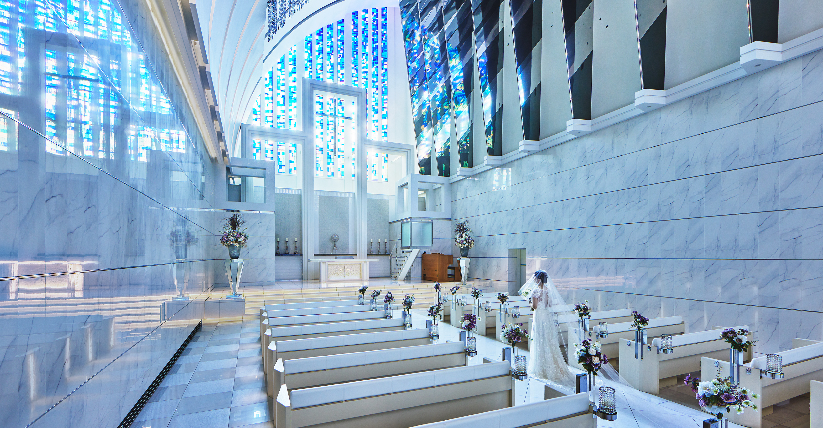 海をイメージした青が印象的な「EAST」、木目基調とした空間と差し込む陽の光があたたかい「WEST」。自然光がより一層ステンドグラスを輝かせ美しい瞬間を演出。ゲスト様の心に、記憶に届く挙式をお約束します