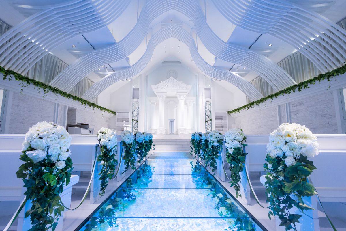 ホワイトとグリーンの装花で彩られた白亜のチャペルはより幻想的な雰囲気を作り、ガラスのバージンロードはまるで水面に立っているかのような姿を現します。