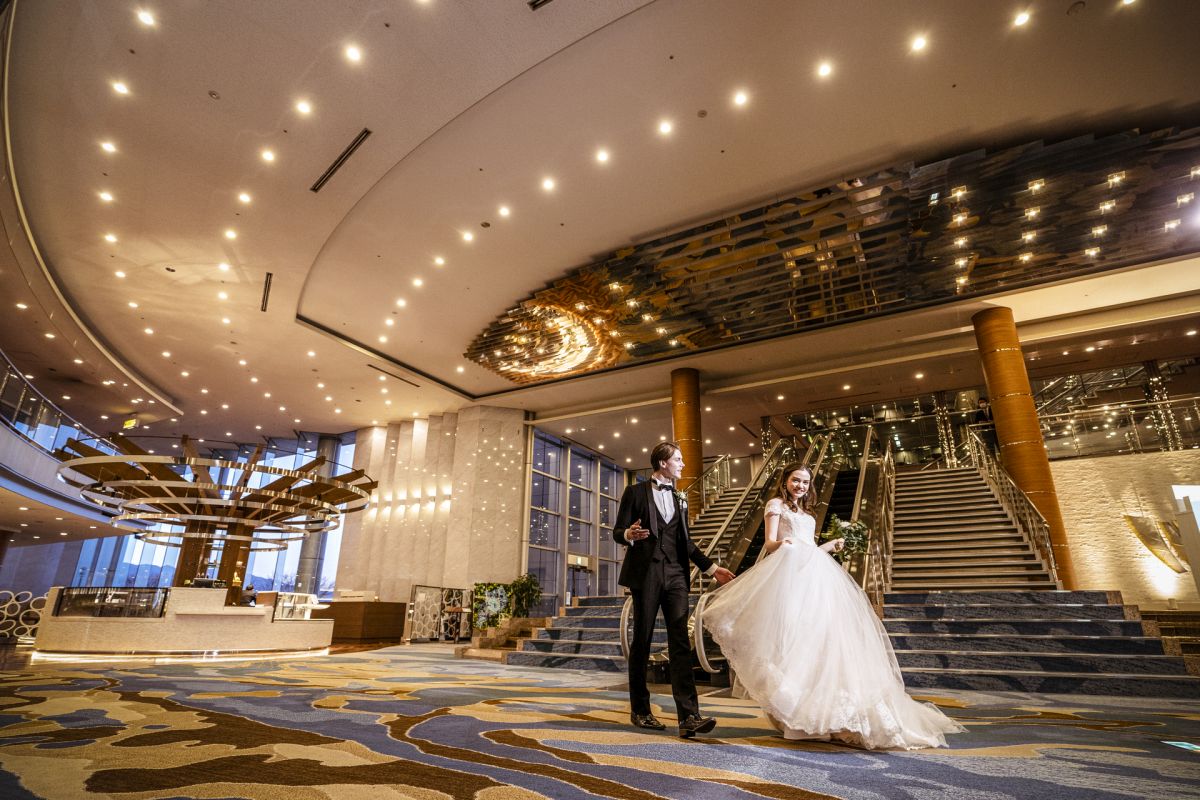 開放的なレイクビューの窓に遮光カーテンを新設し、挙式直前にカーテンオープンをすることで、びわ湖のロケーションをサプライズ演出。より感動的な挙式が始まります。