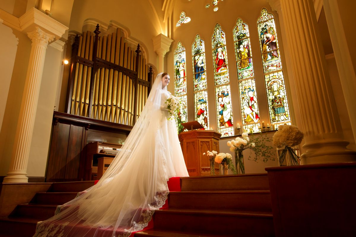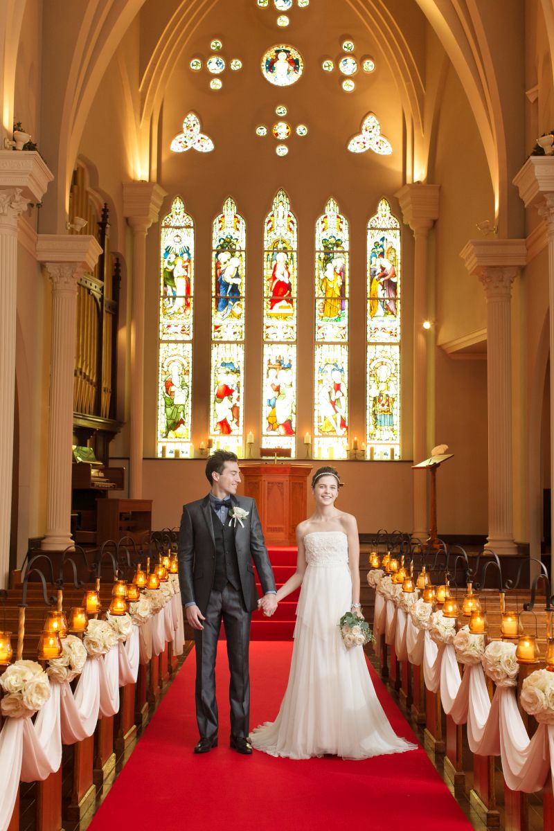 本物のロイヤルステンドグラスは自然光に美しく輝いてドレス姿を厳かに引き立てる。さらに、天井高11m/バージンロード20m/祭壇まで続く5段の階段は、どの席からでもおふたりの姿をしっかりと御覧いただけます。幻想的なキャンドルの灯りや生演奏の重厚な音色に、挙式の感動はより深まるります。