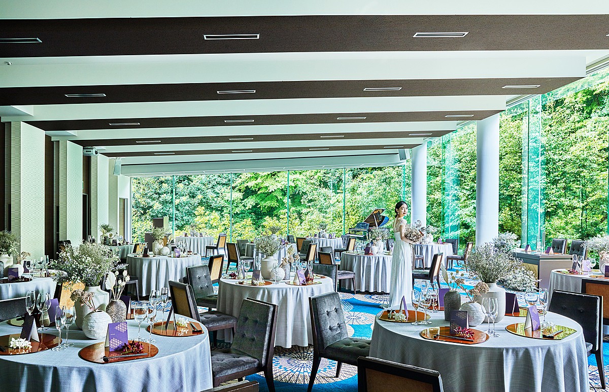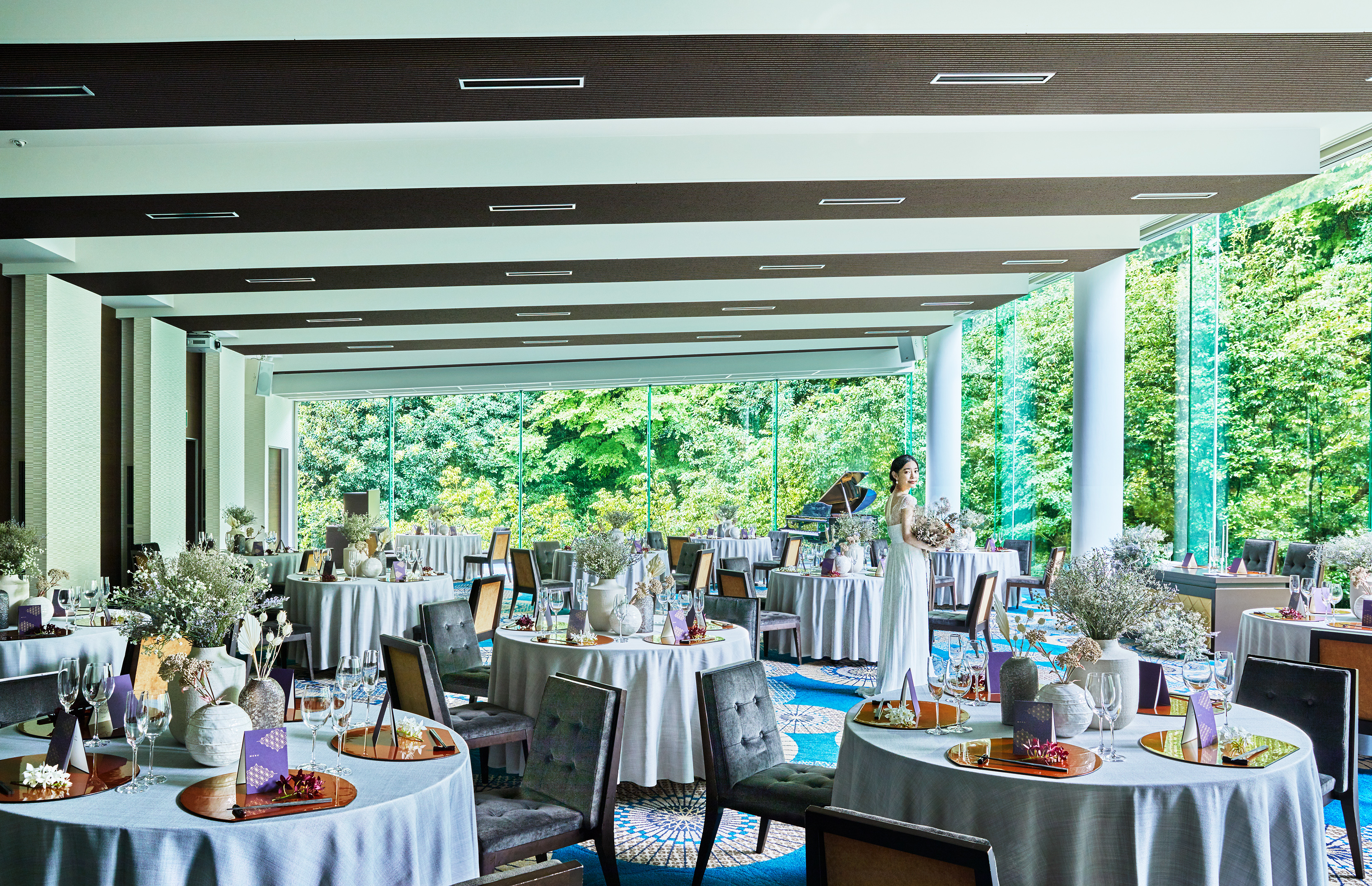 文化財である庭園を望むダイニングは、おふたりのお好みのスタイルによって2会場からお選びいただけます。