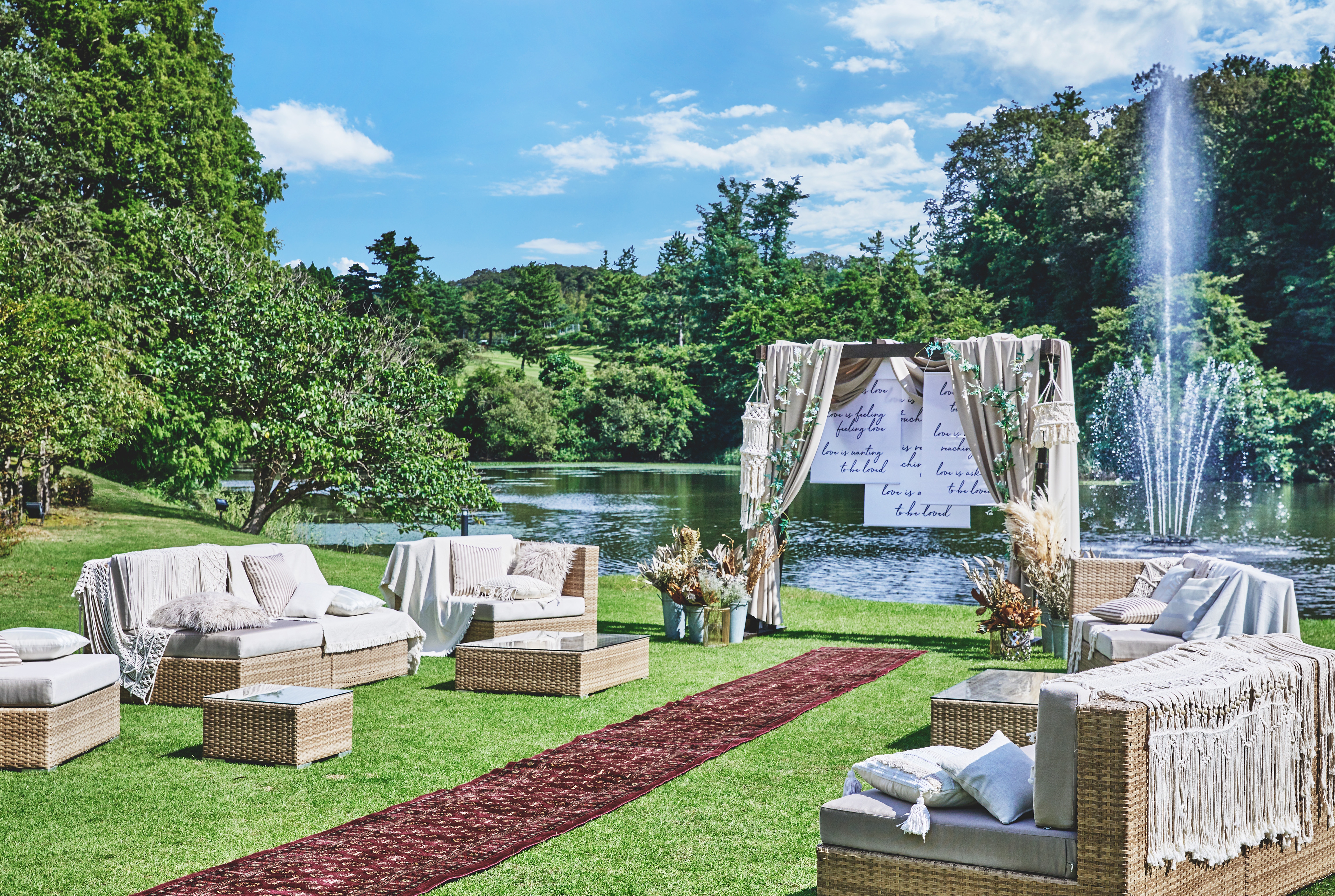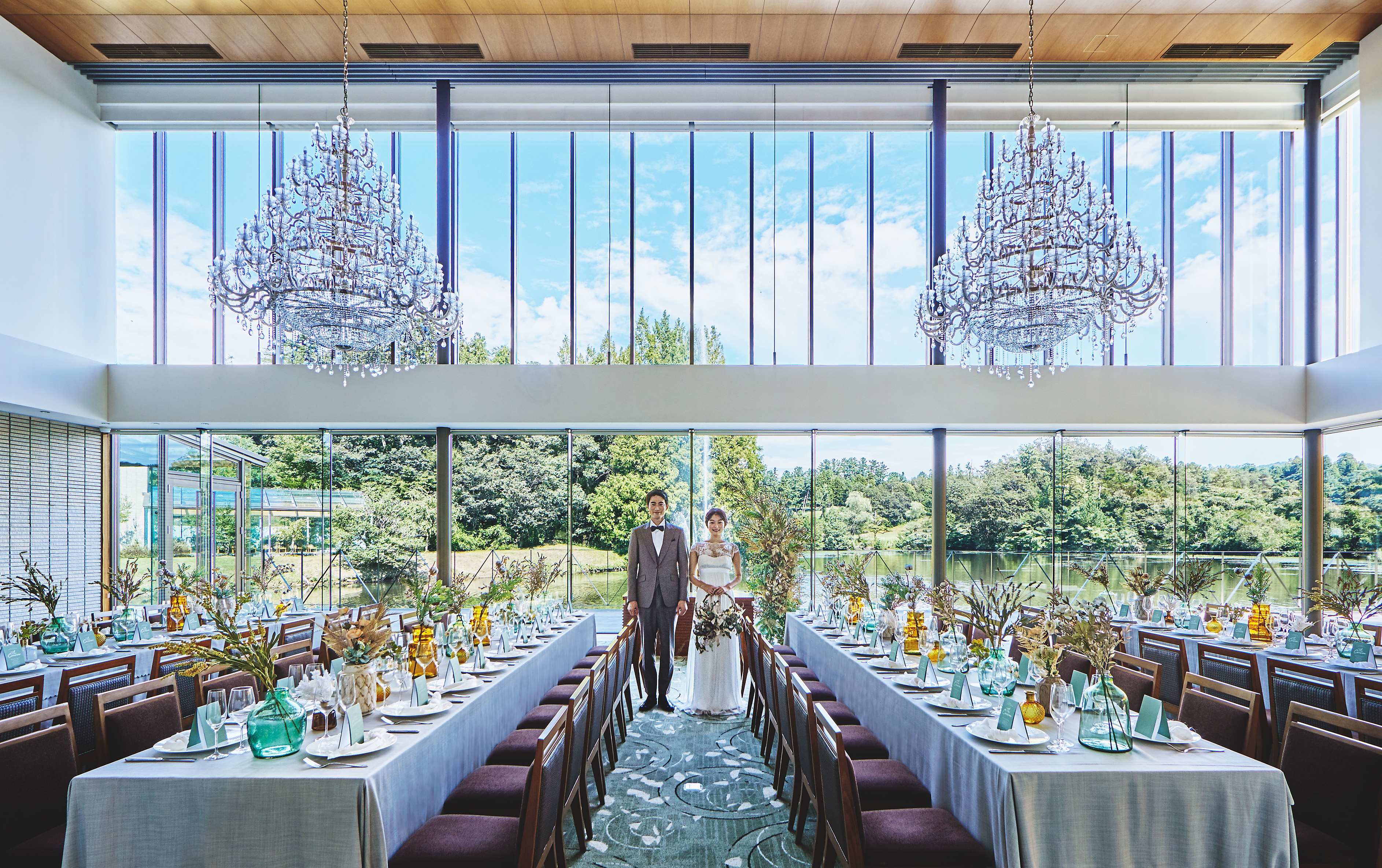 どこまでも広がる高い空、やわらかな緑、清らかな湖畔に面したロケーションがハレの日の舞台に。