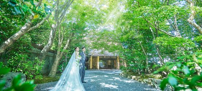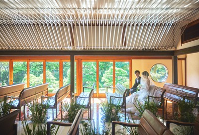 チャペルは木の柱や梁が醸し出す日本建築ならではの風格と響き合うデザイン。一面の窓から降り注ぐ自然光や木の温もりに包まれます。木々と陽光に祝福されて、ゲストと心の通い合う挙式を。