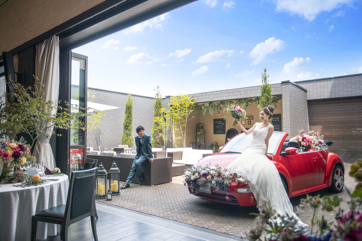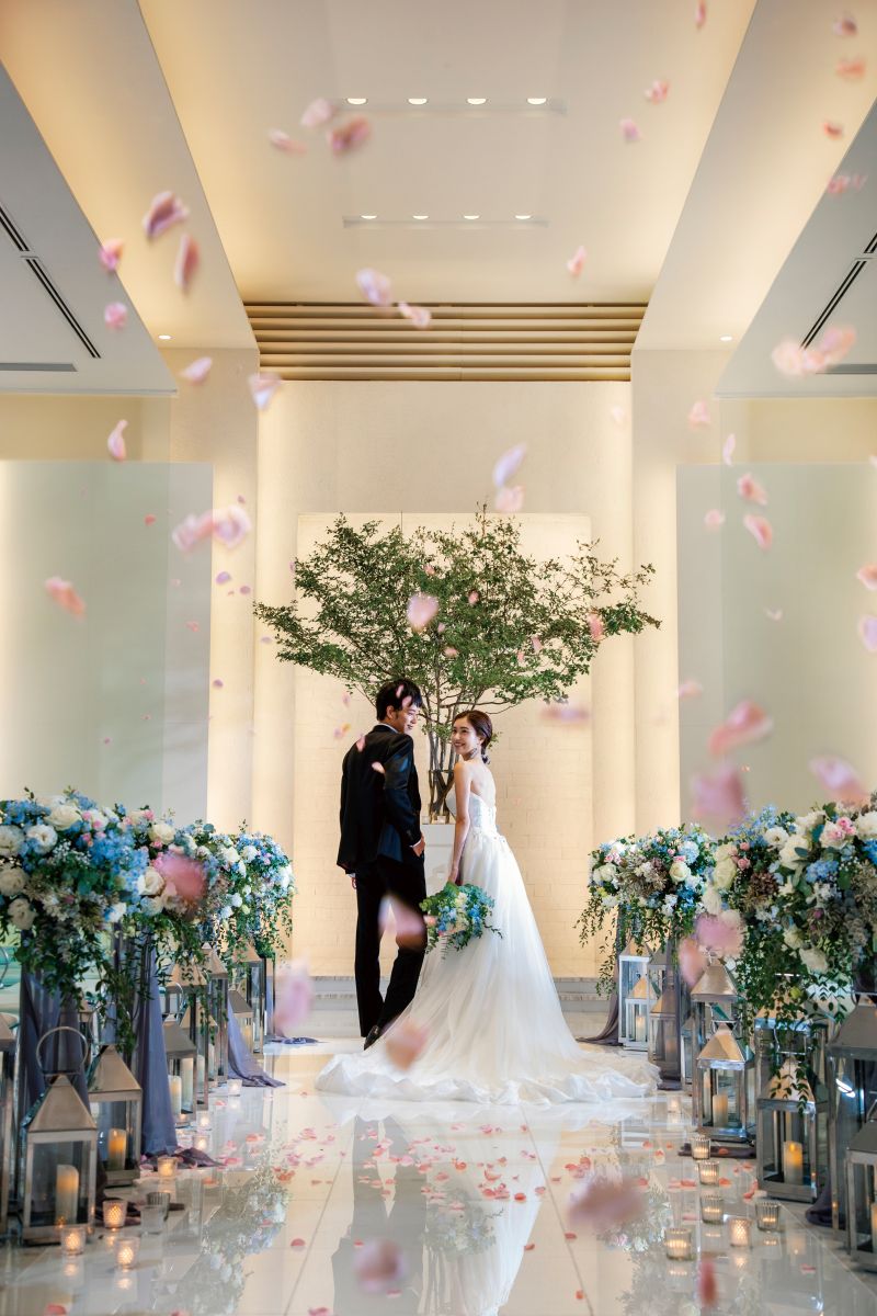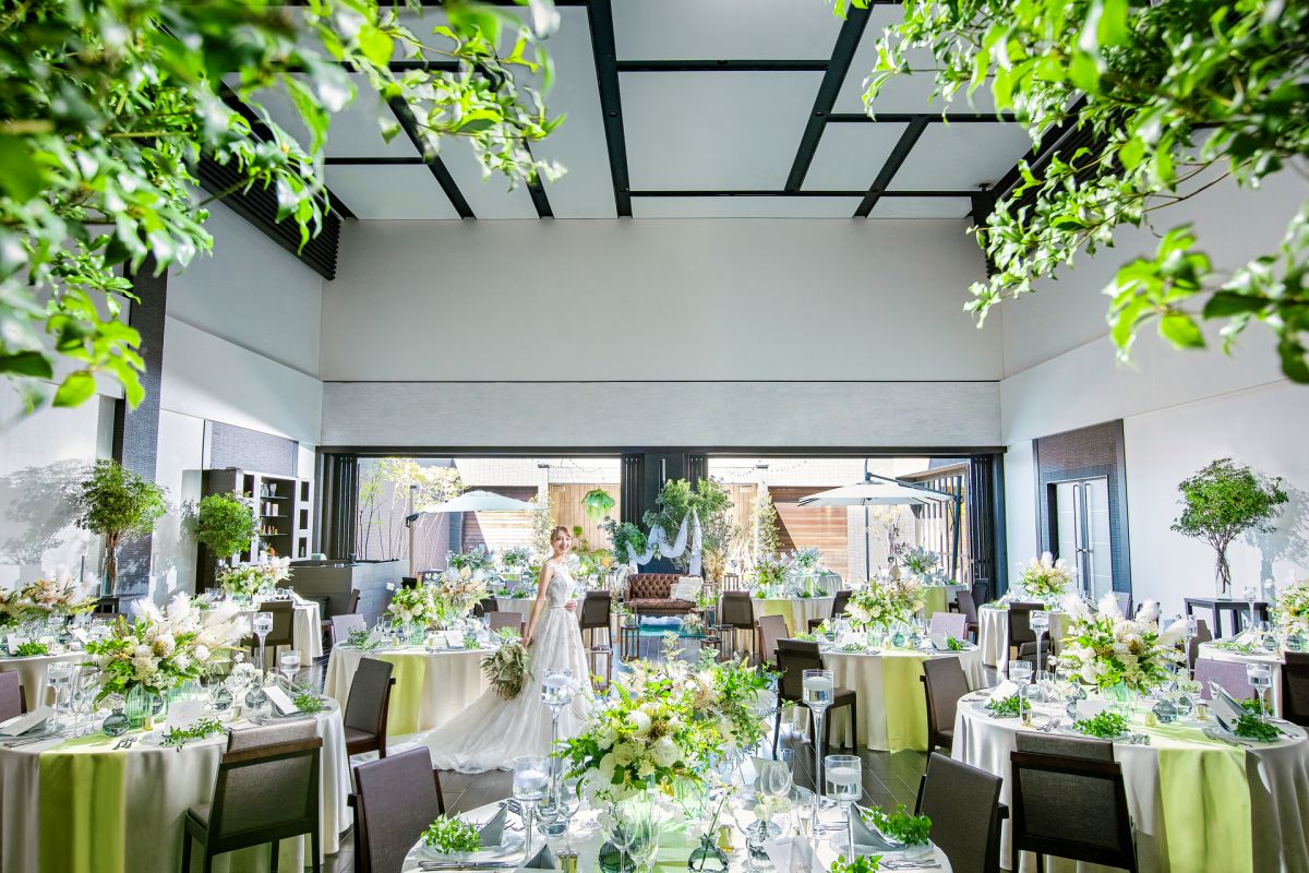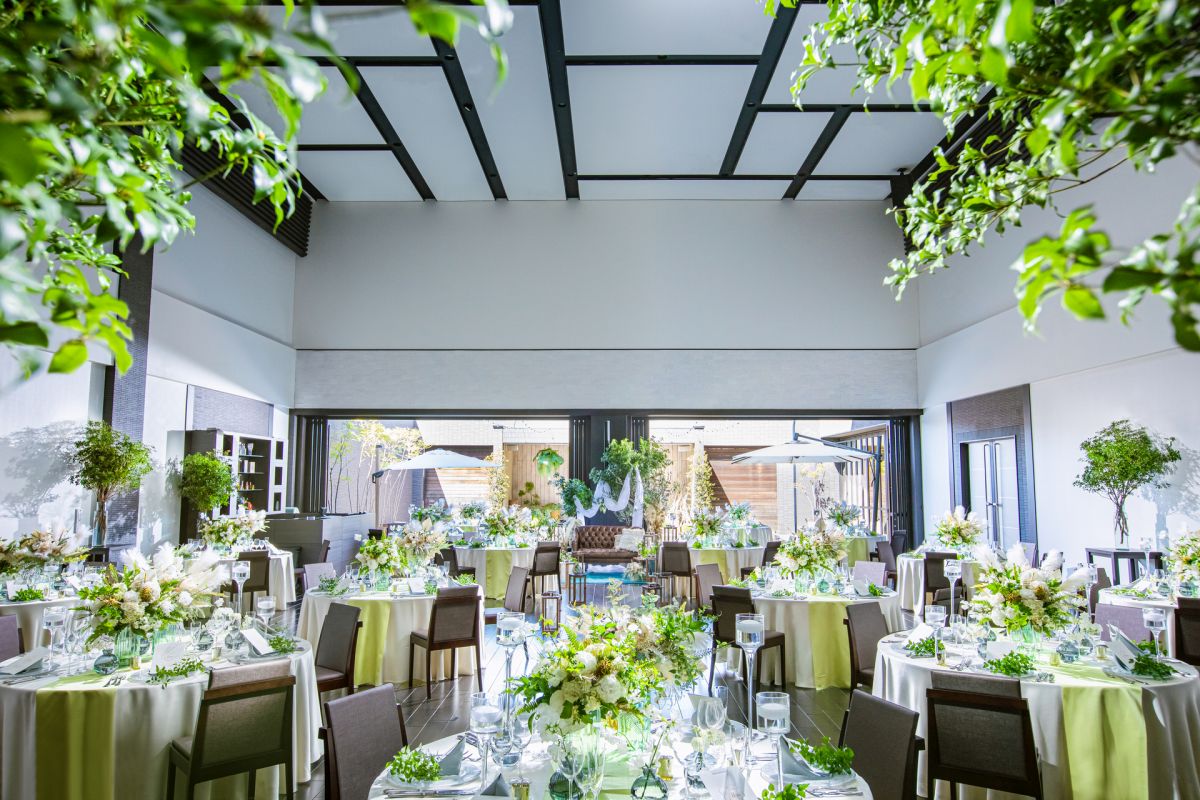 7.5mもの天井やガーデンに面した一面の窓が開放感を演出する空間。開け放てばガーデンと一続きになる大きな窓からは温かな自然光が差し込み、明るく華やかな雰囲気に満ちた結婚式を行えます。