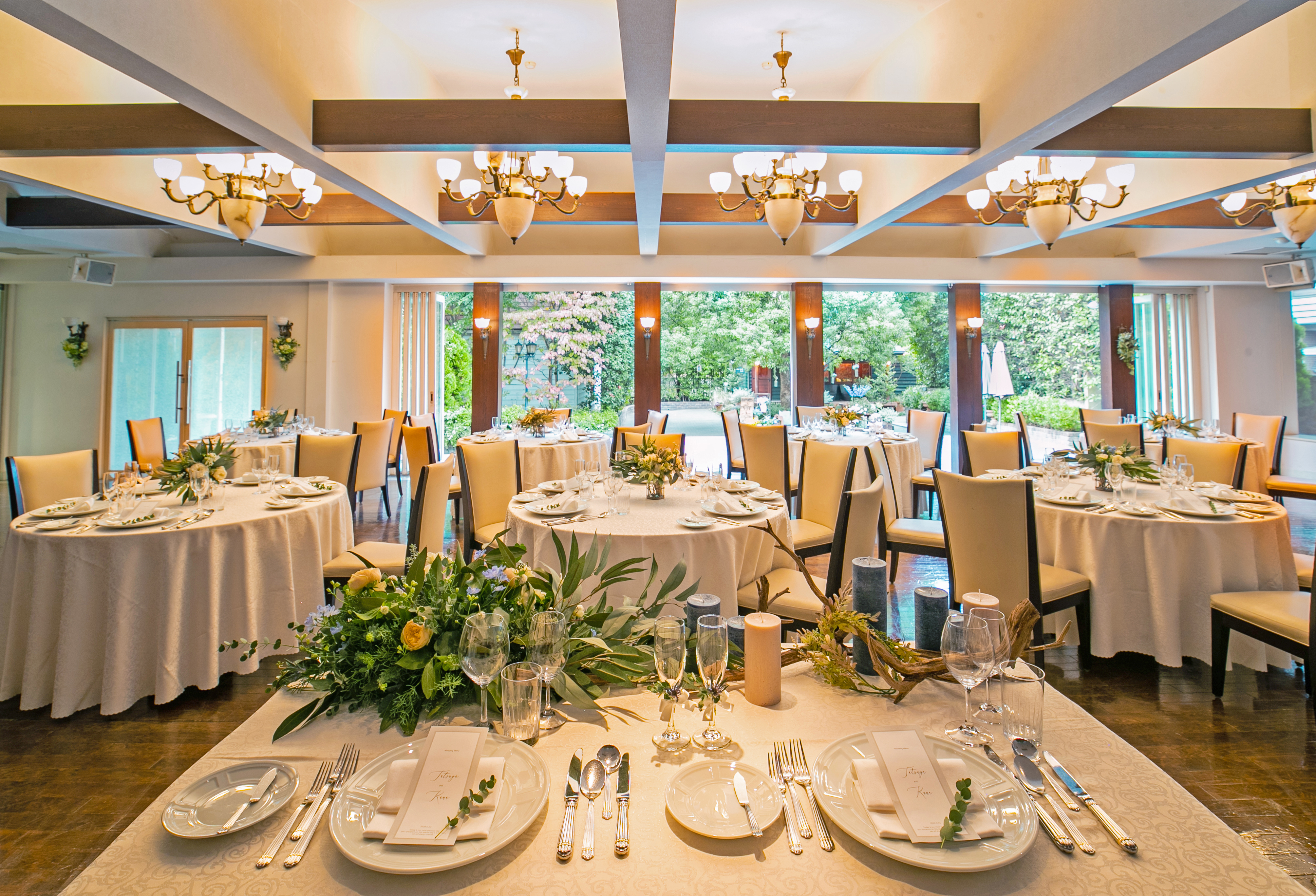 高原に佇むような森のチャペルは、なんだか絵本に出てきそうな緑豊かな空間。披露宴は葉山庵のメインダイニングを貸し切って、ホワイト&ブラウンを基調とした大人の雰囲気で全館貸切のウエディングパーティ!