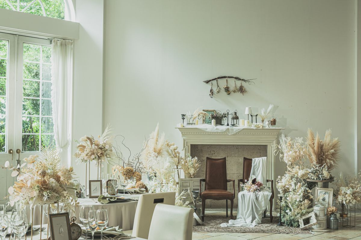 会場使用料全額サービス/乾杯酒/ウェルカムドリンク/ライティング/レセプタント/介添料/テーブルコーディネート/ペーパーアイテム/当日衣装/美容/上映機材/バスなど含む