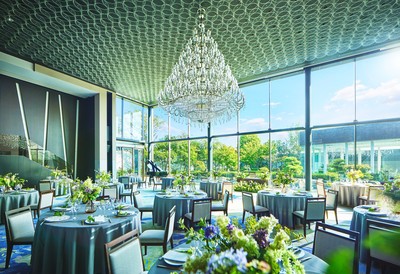 ガーデンを望めるパーティ会場は、大きなシャンデリアが特徴の優美な空間。会場に併設したオープンキッチンでの料理パフォーマンスや、彩り豊かなデザートビュッフェなど、こだわりのおもてなしでゲストを魅了して。