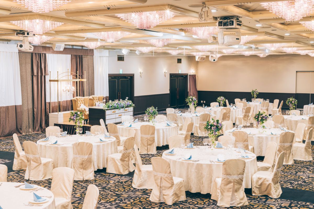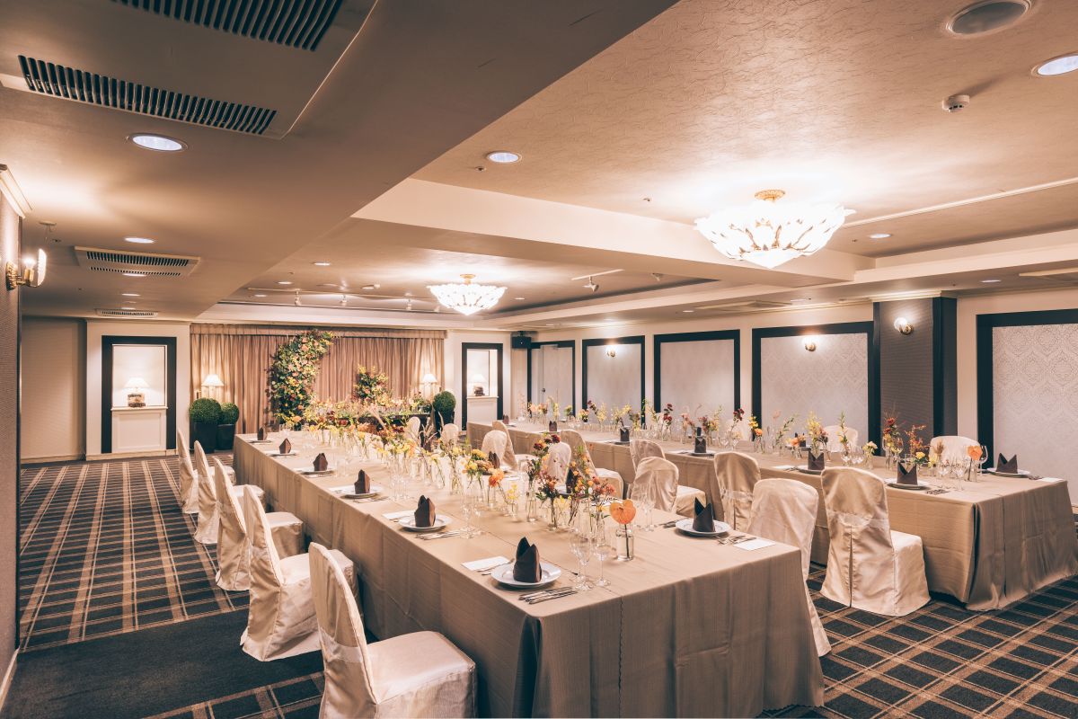 スカイバンケット「オーロラ」は左右両面が窓になっており、明るい光が差し込む開放感あふれる会場。自然光と盛岡市内を一望できる景色が、おふたりの特別な空間をさらに輝かせます。ワンフロア貸切でゲストとの大切な時間を気兼ねなくお過ごしください。