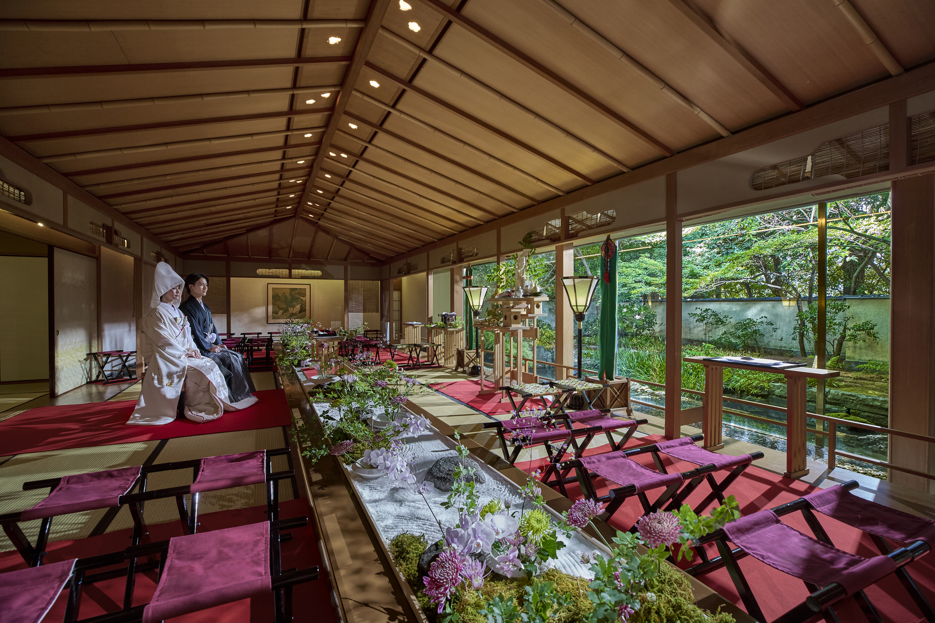 1日1組限定で利用できる贅沢な料亭ウエディング。四季折々の美しい庭園と、歴史ある建築が和の魅力を引き立てます。都会にいながら静寂と緑に包まれる非日常の空間で、格式高い結婚式が叶います。