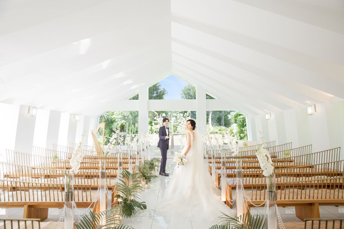 エントランスに入るとそこは別世界。たくさんの緑に囲まれた中庭を抜け、目の前の扉を開くと、目に映るのはピュアホワイトの誓いの舞台。ハープの生演奏に導かれながら、差し込むやわらかな光と正面に佇む水のせせらぎが、おふたりの誓いをやさしく見守ります。