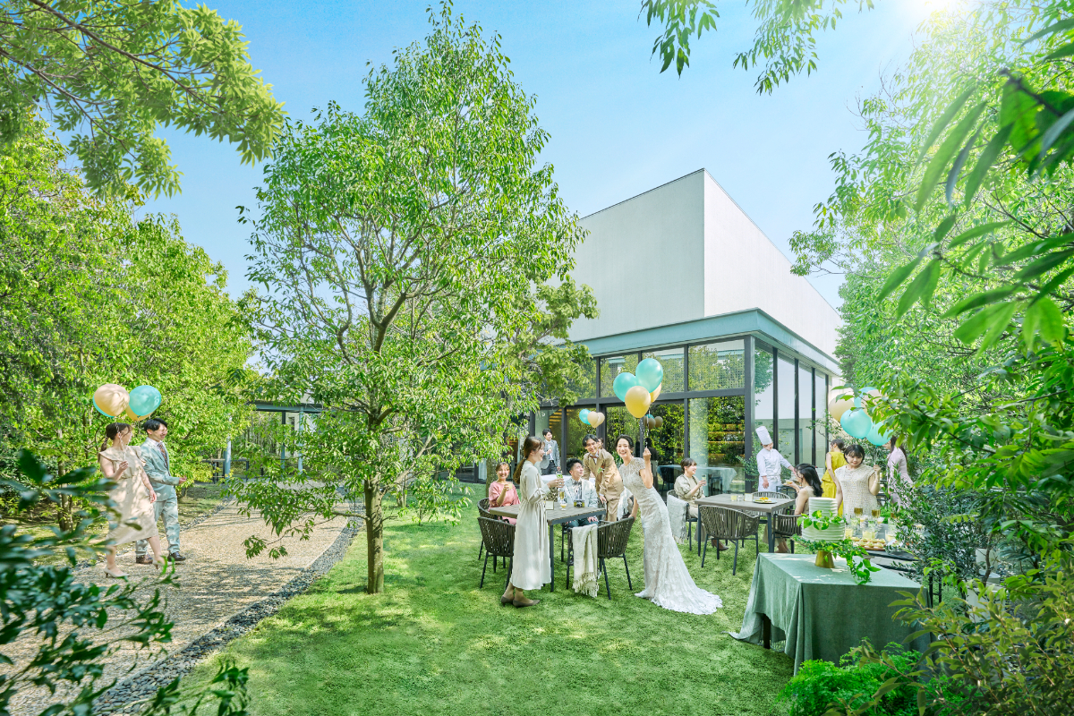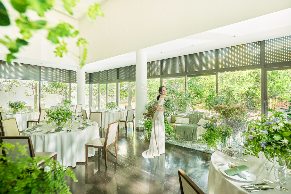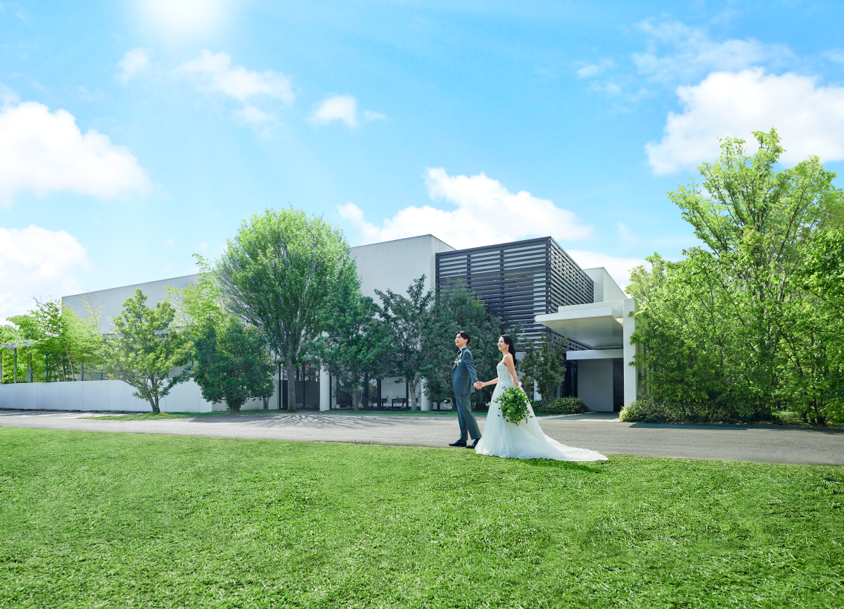 研究学園駅から徒歩5分の便利なロケーションに広がる、緑豊かな別世界。四季折々の自然に包まれたモダンなウエディングステージで、おふたりらしいシーンに満ちた人生最良の一日をお過ごしください。