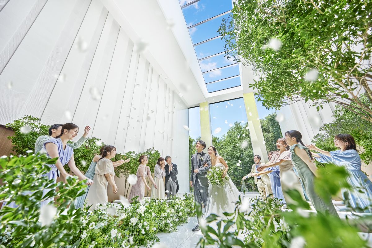 扉を開けた瞬間に心奪われる、息をのむ開放感。天井から差し込む優しい光が印象的なチャペルなら、時間とともに移ろいゆく空の色も大切な思い出になるはず。神前式や人前式などふたりらしい誓いが叶うのも魅力です。