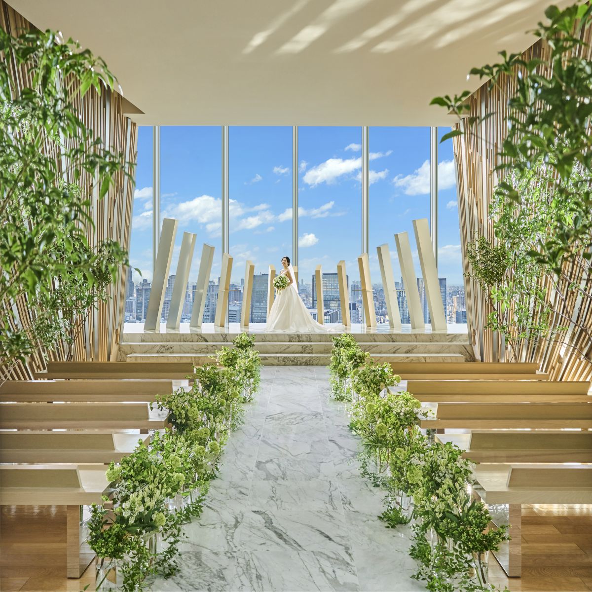 花嫁姿を格上げする都心の絶景を背に、憧れを叶えるウエディングの舞台。チャペル内には木の温もりと豊かな自然が溢れアットホームな雰囲気を演出してくれます。イルミネーションが煌めくナイトウエディングも必見です。