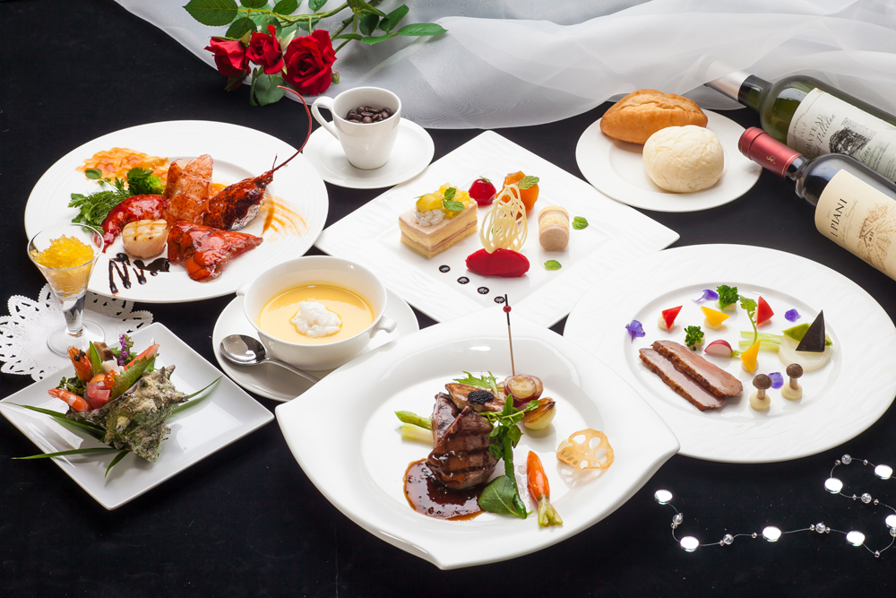 窓の外には滝の流れるプライベートガーデンやプールがあり、お食事中もガーデンの景色をお楽しみいただけます。
