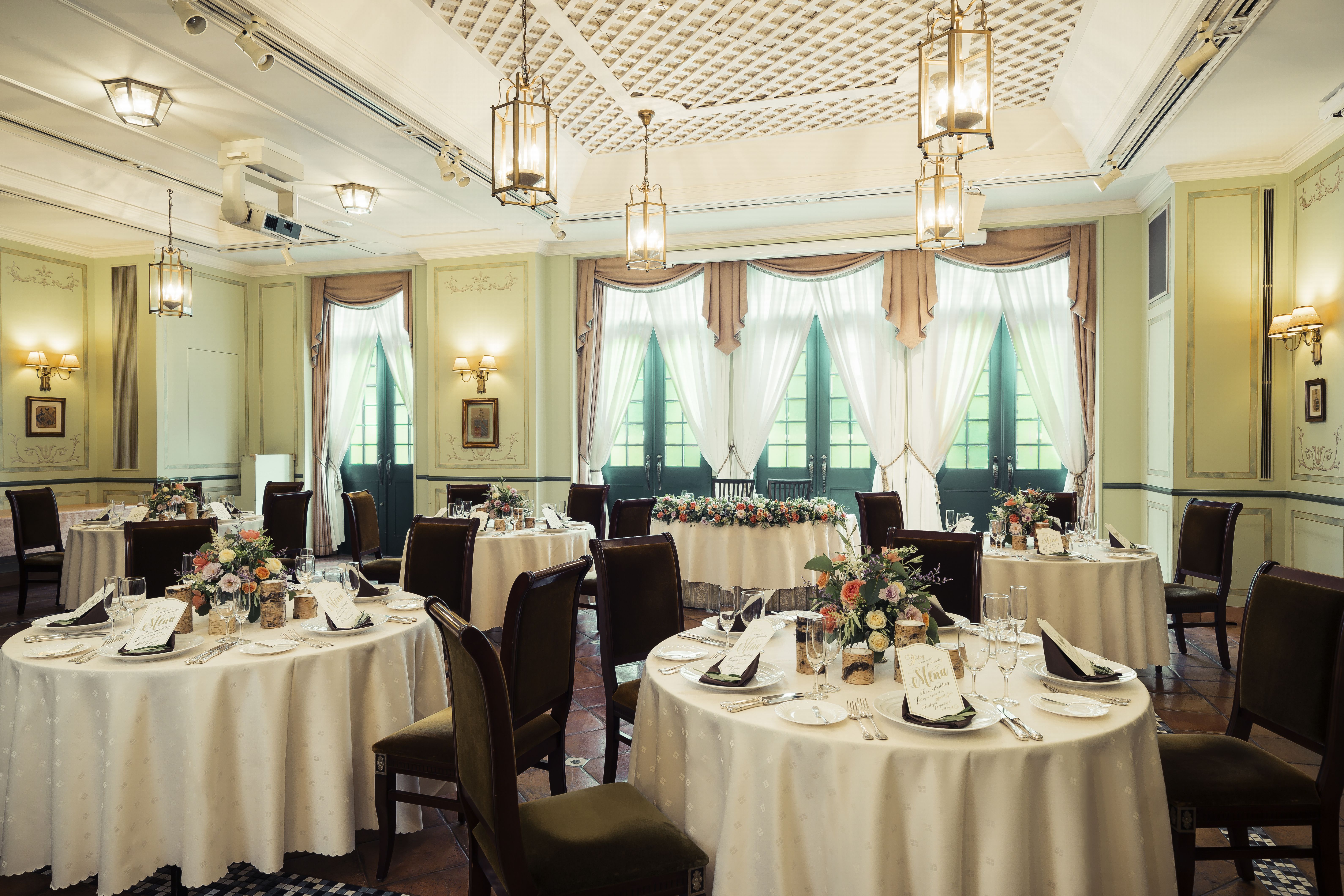 中庭に面し、明るく開放的な披露宴会場の「アマリアサロン」は、柔らかなグリーンと白を基調としたヨーロピアンテイスト。会場内は、20名様から50名様まで入ることができ、丸テーブルや縦長い晩餐会スタイルなど、お好みに合わせたレイアウトも可能。ナチュラルな美しさが魅力の中庭では、ゲストの皆さまと集合写真も撮影いただけます。