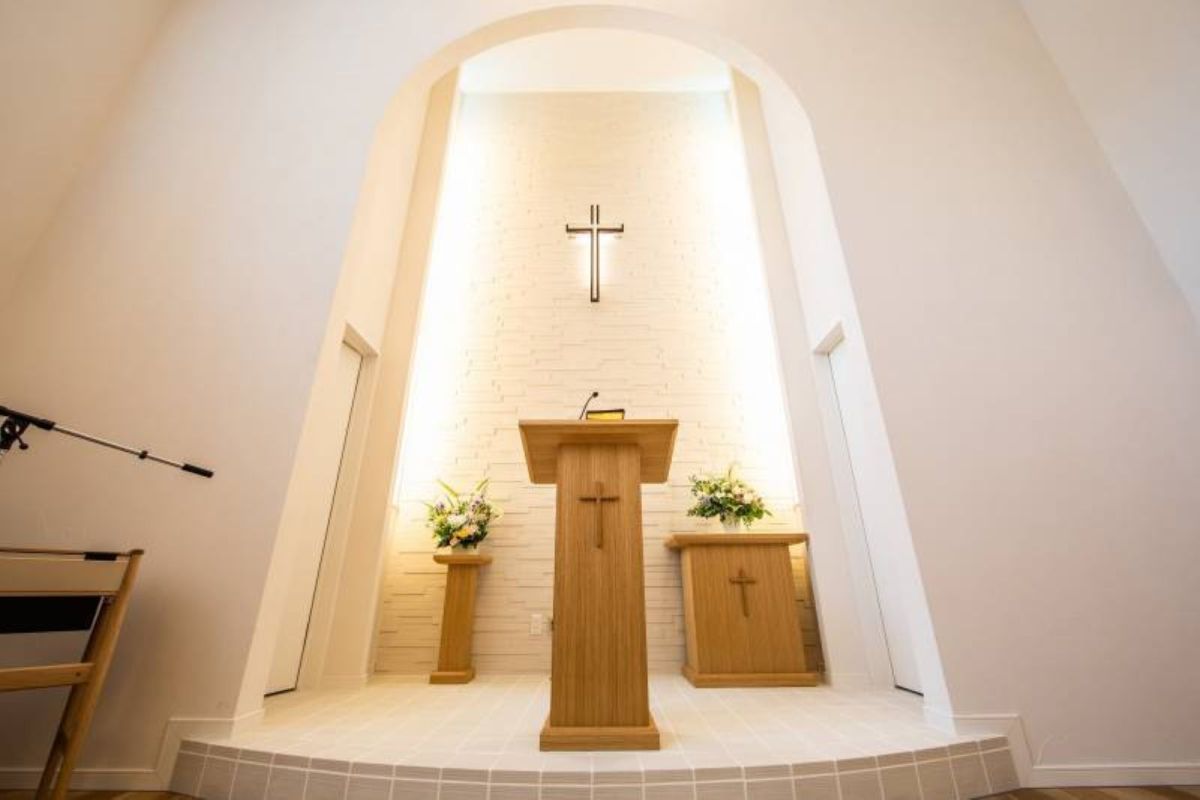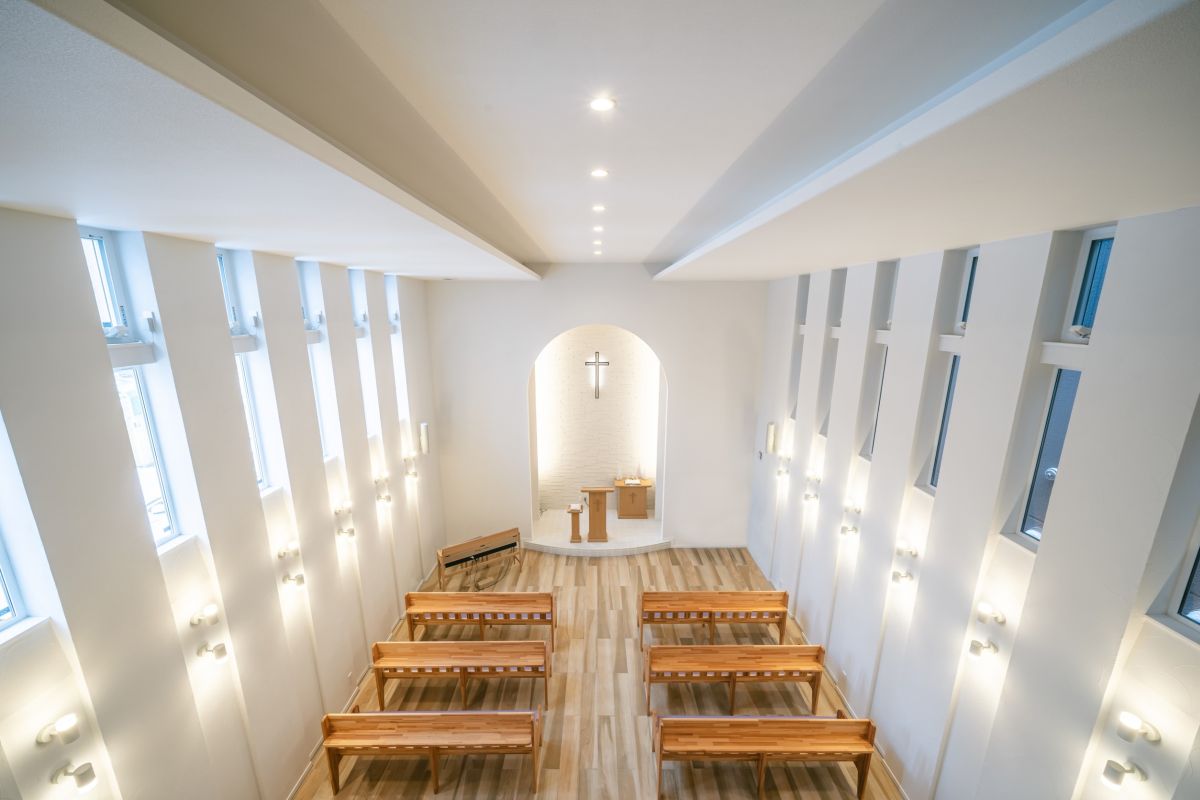 収容人数30名までの少人数チャペル。実際に礼拝が行われるプロテスタントの教会で、少人数ながらも本格教会式を望むふたりにおすすめのチャペルです