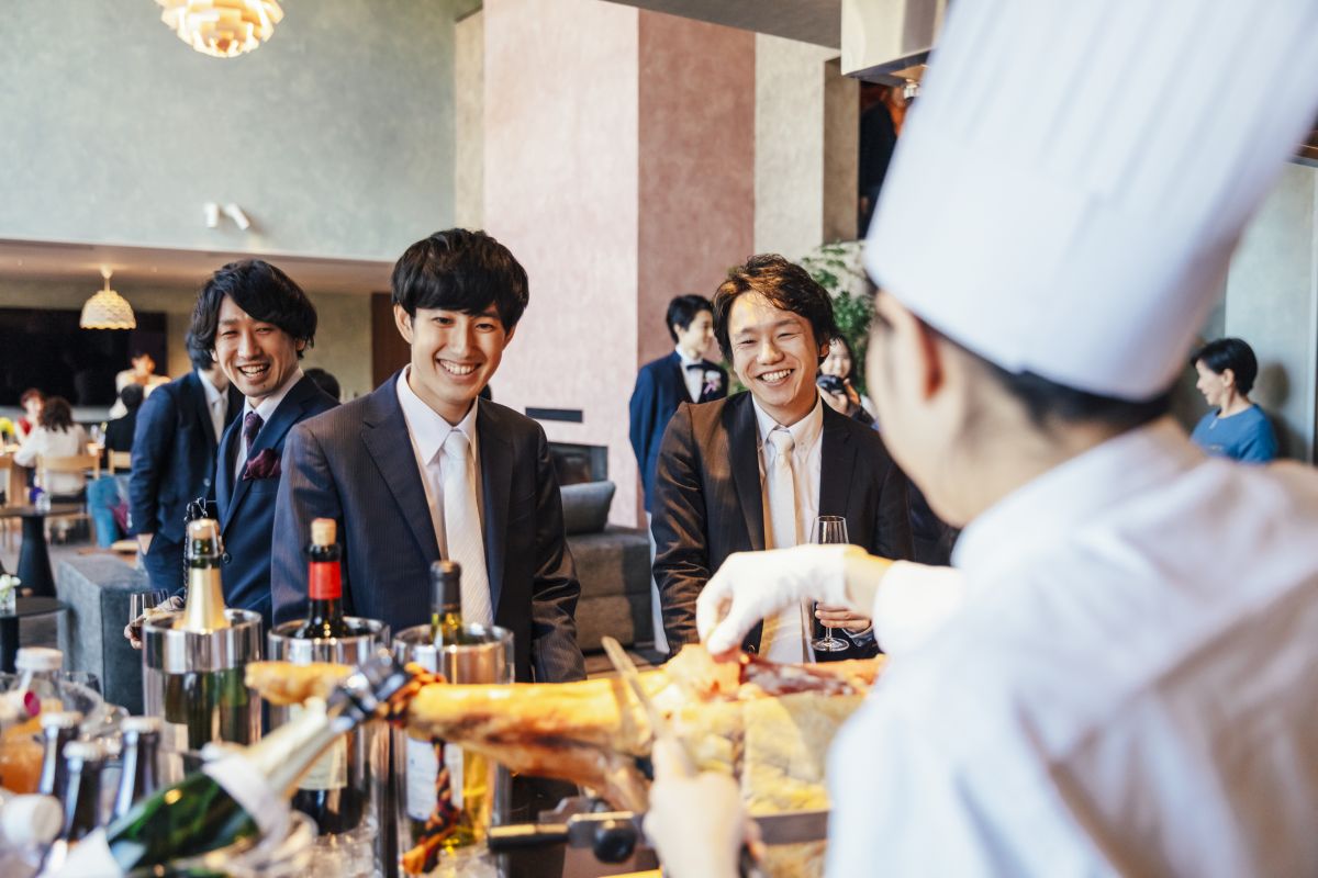 まるで自分たちの別荘に招いたかのように、自然体でくつろげる「別荘ウエディング」。おふたりはゲストを出迎え、目の前で仕上がる料理を一緒に味わい、団らんを楽しむ、自由で贅沢なひとときをお過ごしいただけます。