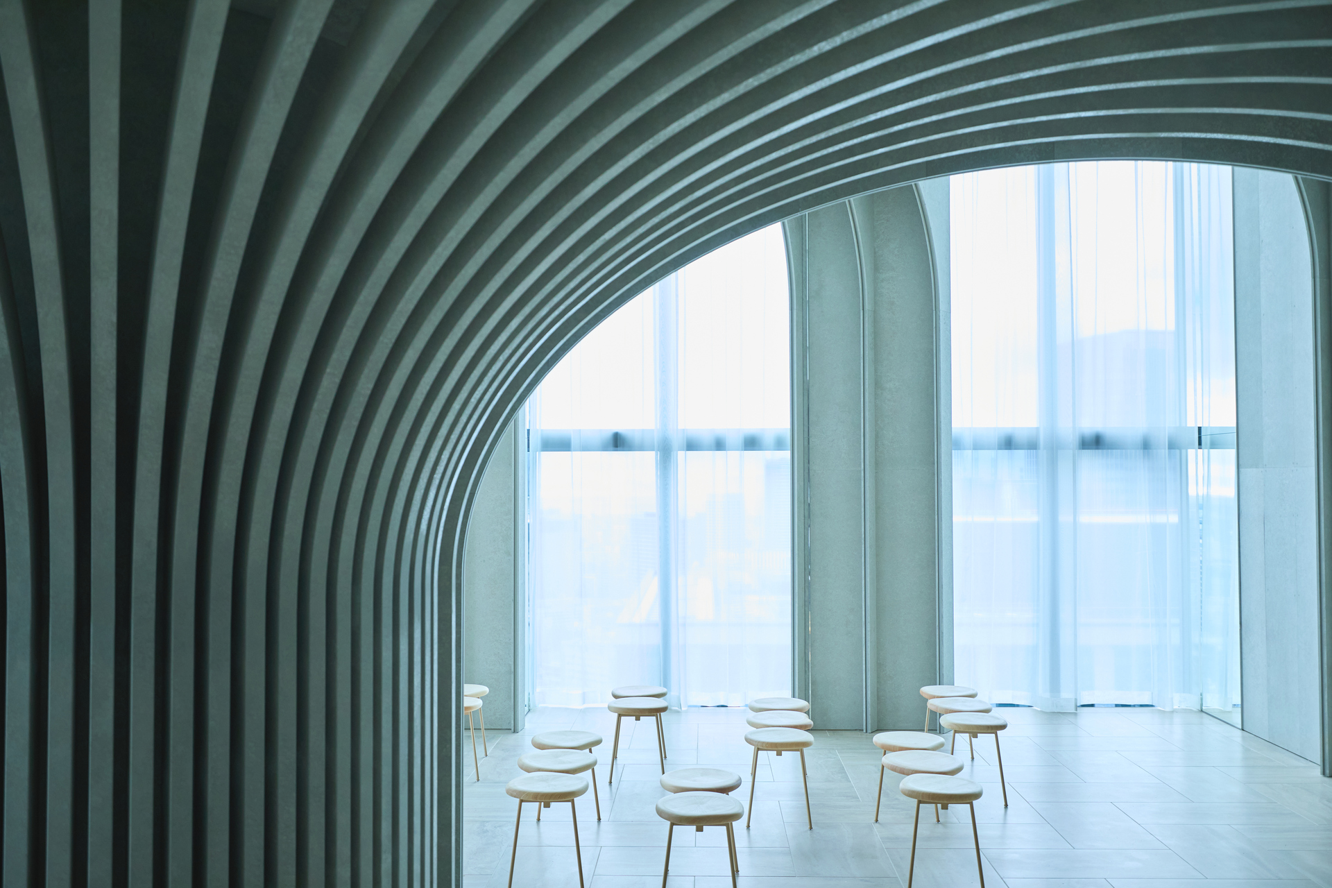 季節や時間で表情が変わる、高さ4mの窓から光が差し込む会場