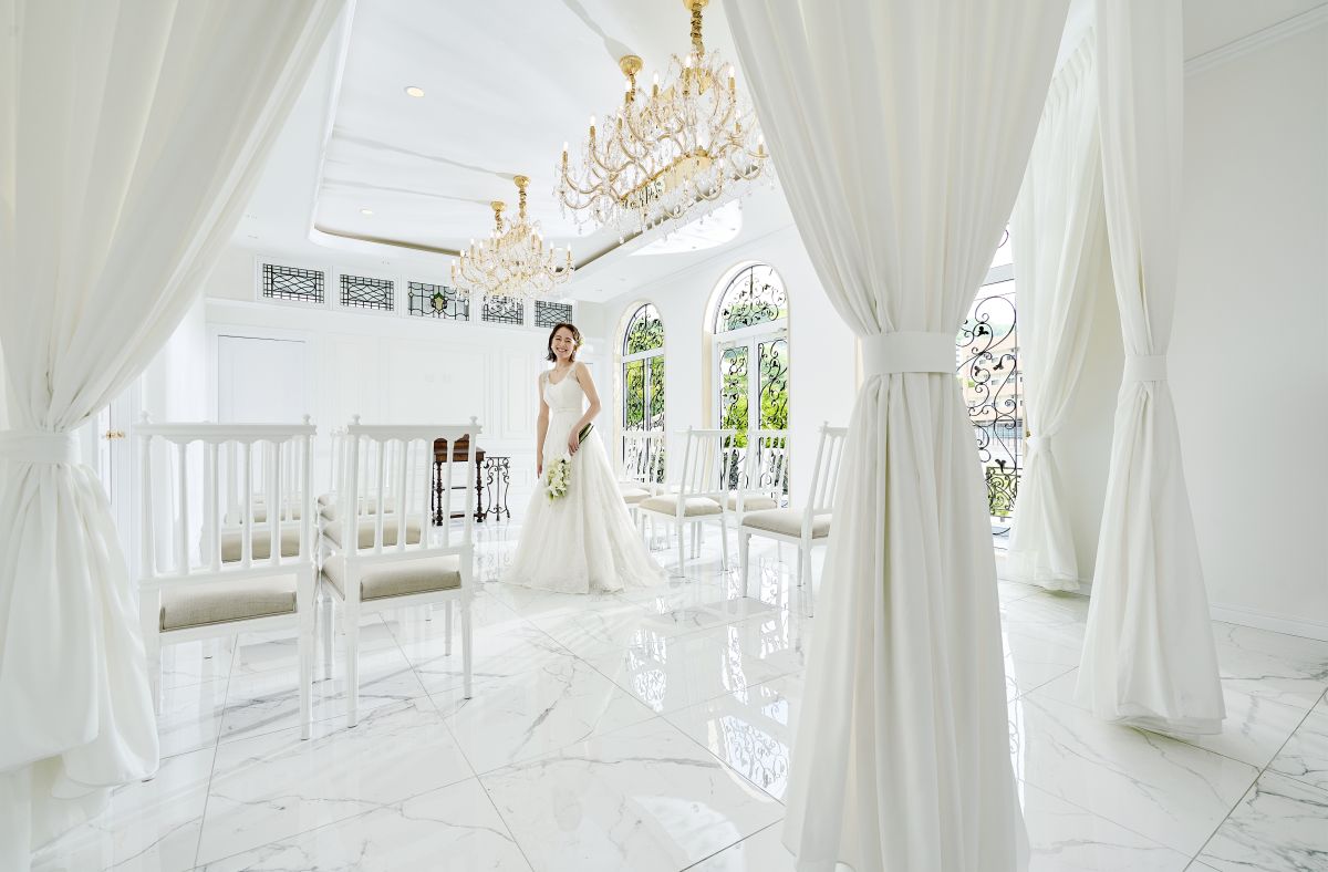 チャペル内装花付、結婚証明書プレゼント、ウェルカムドリンクサービス、小物類・リハーサルメイク無料、ゲスト人数に関わらず、全館1日貸し切り