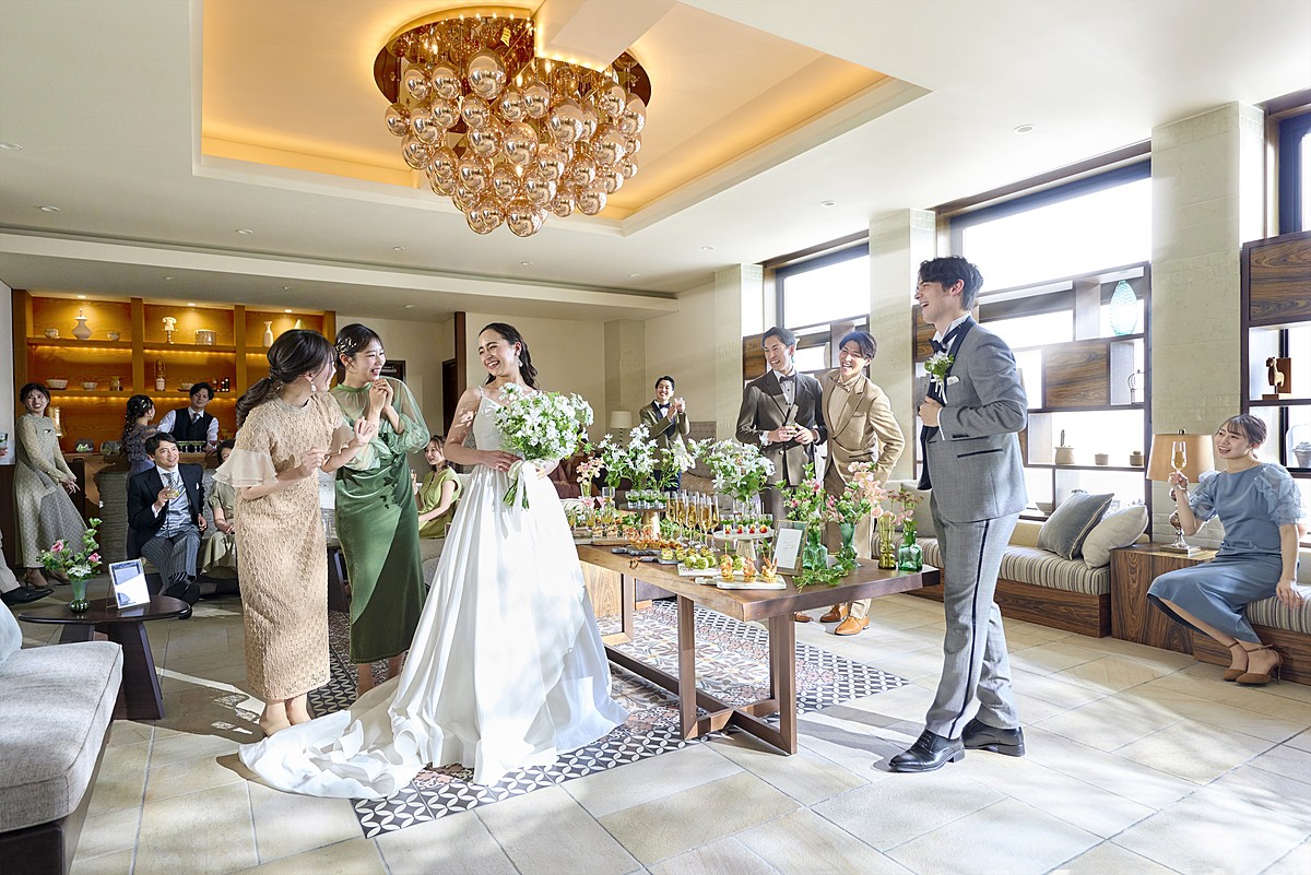 【プレゼント】ウェルカムドリンク・メインテーブル装花・司会・音響機材照明使用料【値引き】会場費・衣装"