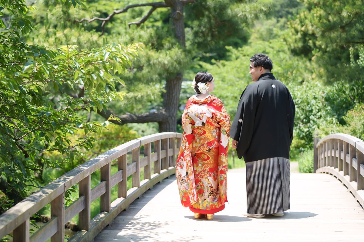 お支度の最中より撮影をスタート。撮影のお時間をゆったりと確保できるのも1日1組ならではの嬉しいポイント。四季の調和が美しい庭園で心に残るお写真をたくさん残していただけます。