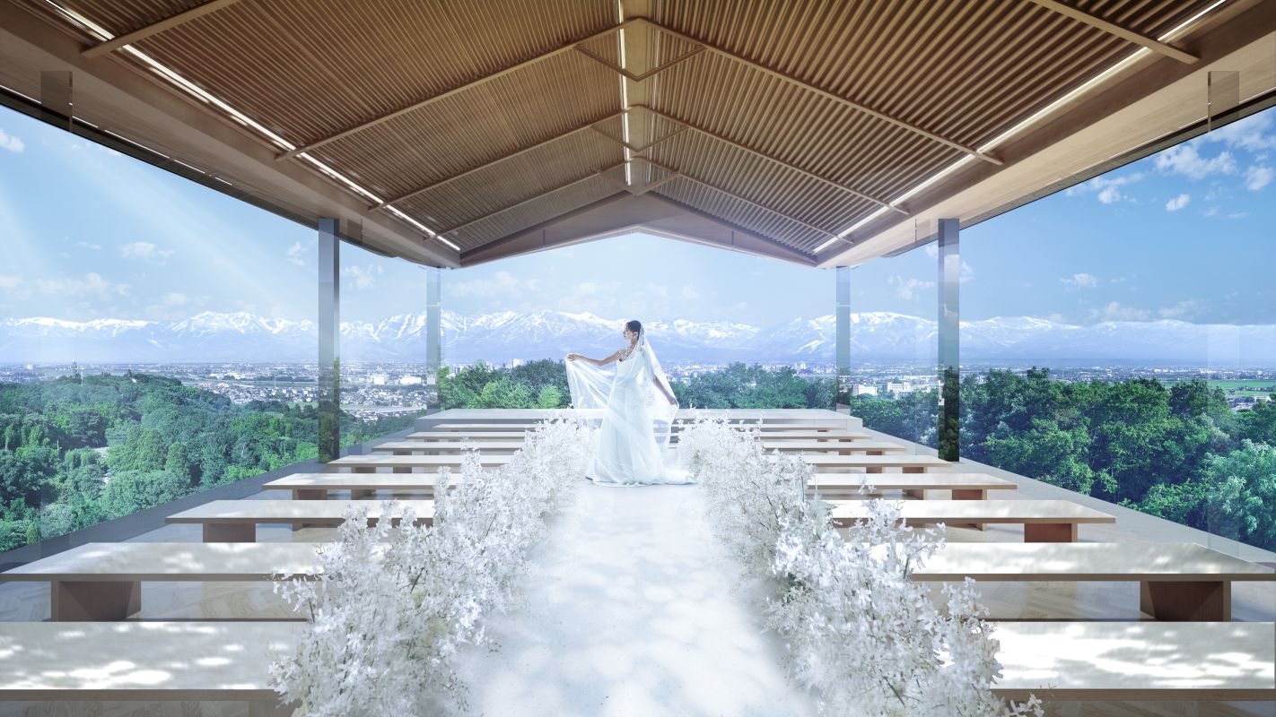 渡り廊下の先に現れるのは、陽光と美景に溶け込むような360度ガラス張りのチャペル。まるで雲の上にいるかのような幻想的な空間からは立山連峰が見渡せ、翡翠色の床が花嫁の歩みをやさしく照らす。/完成予想図