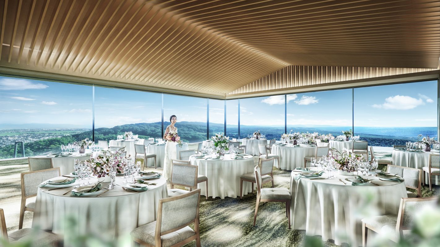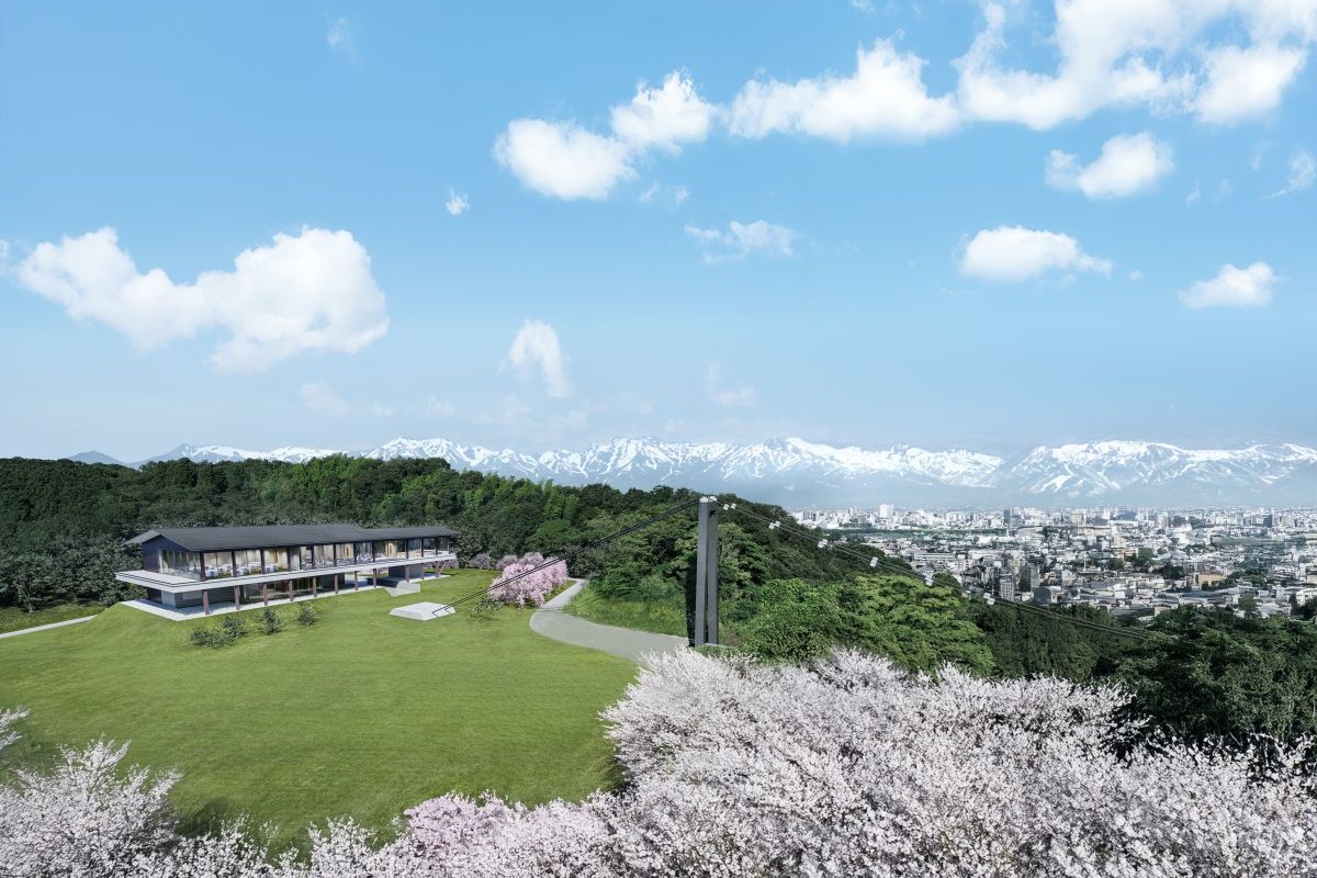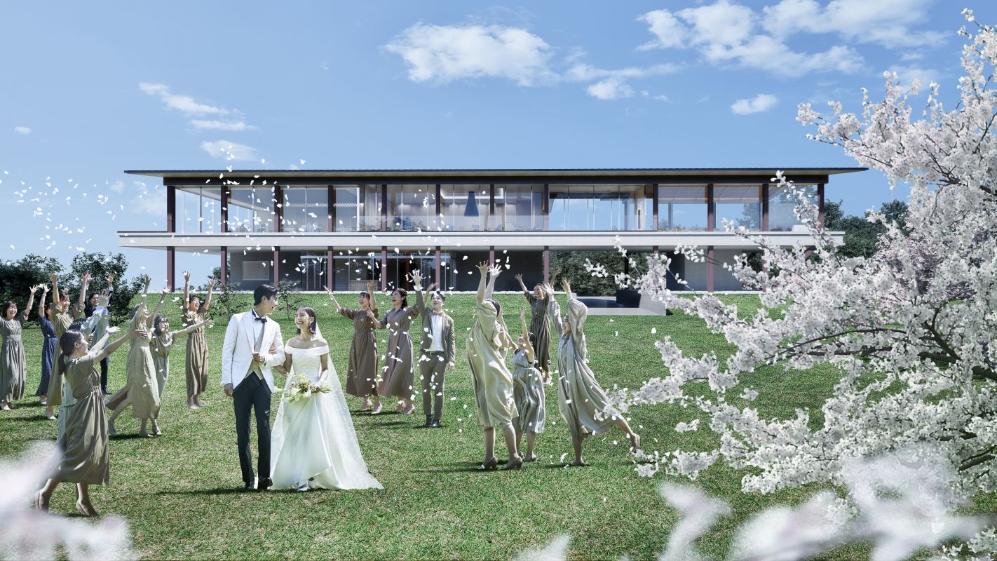 富山駅から車でわずか10分。美しい自然に抱かれたこの場所では、空間だけでなく広がる景色までも貸切に。訪れる全ての人をふたりらしい世界観でやさしく包み込み、心に残るおもてなしが叶う。/完成予想図