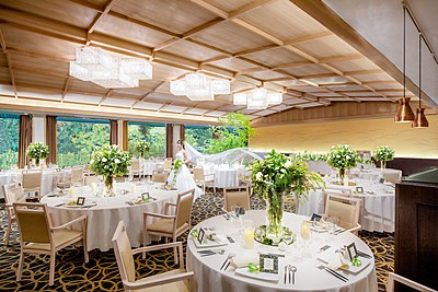 伝統的な和の意匠と自然光が調和する空間は、和やかで格式あるひとときを演出し、心温まる披露宴を叶えます。神前式の余韻を感じながら穏やかなひとときをお過ごしいただけます。