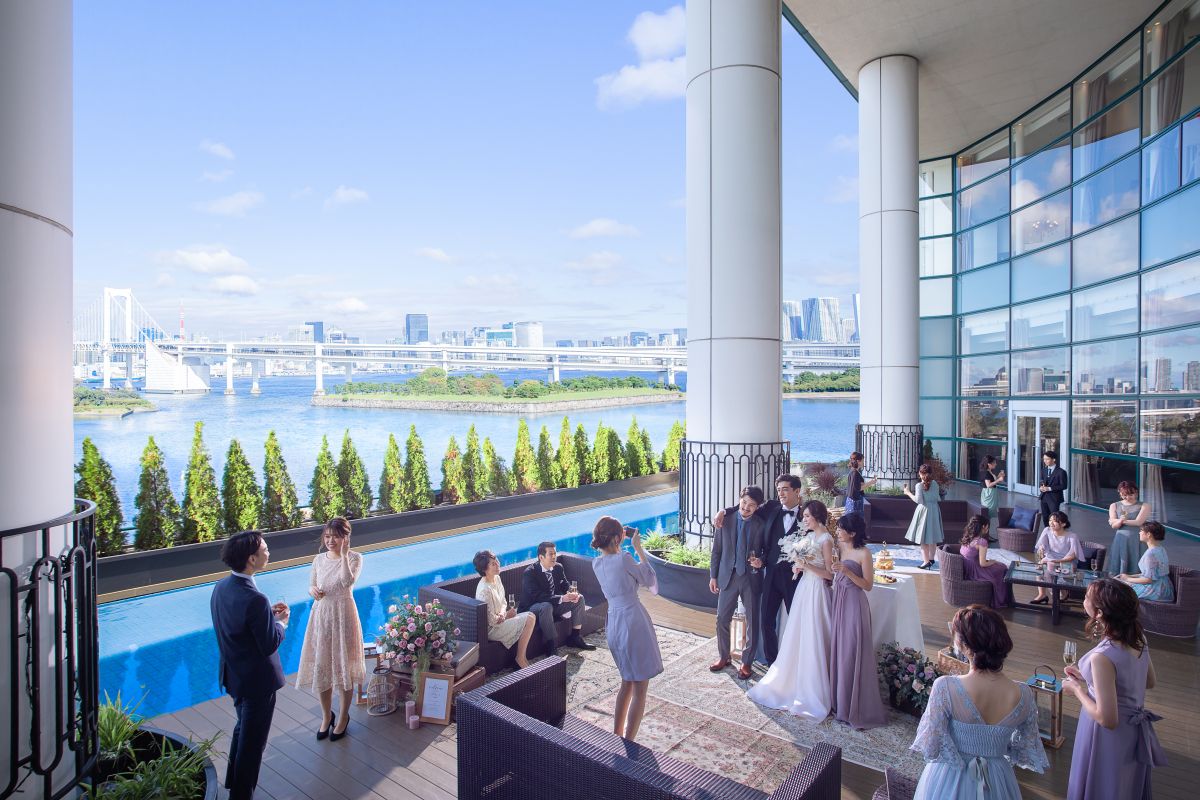 披露宴会場からひと続きのテラスは、遮るもののないオーシャンビューが魅力。ウェルカムドリンクを手に取ったり、夜景を背景に過ごしたりと、お台場ならではのロケーションをゲストと一緒に間近で満喫できます。