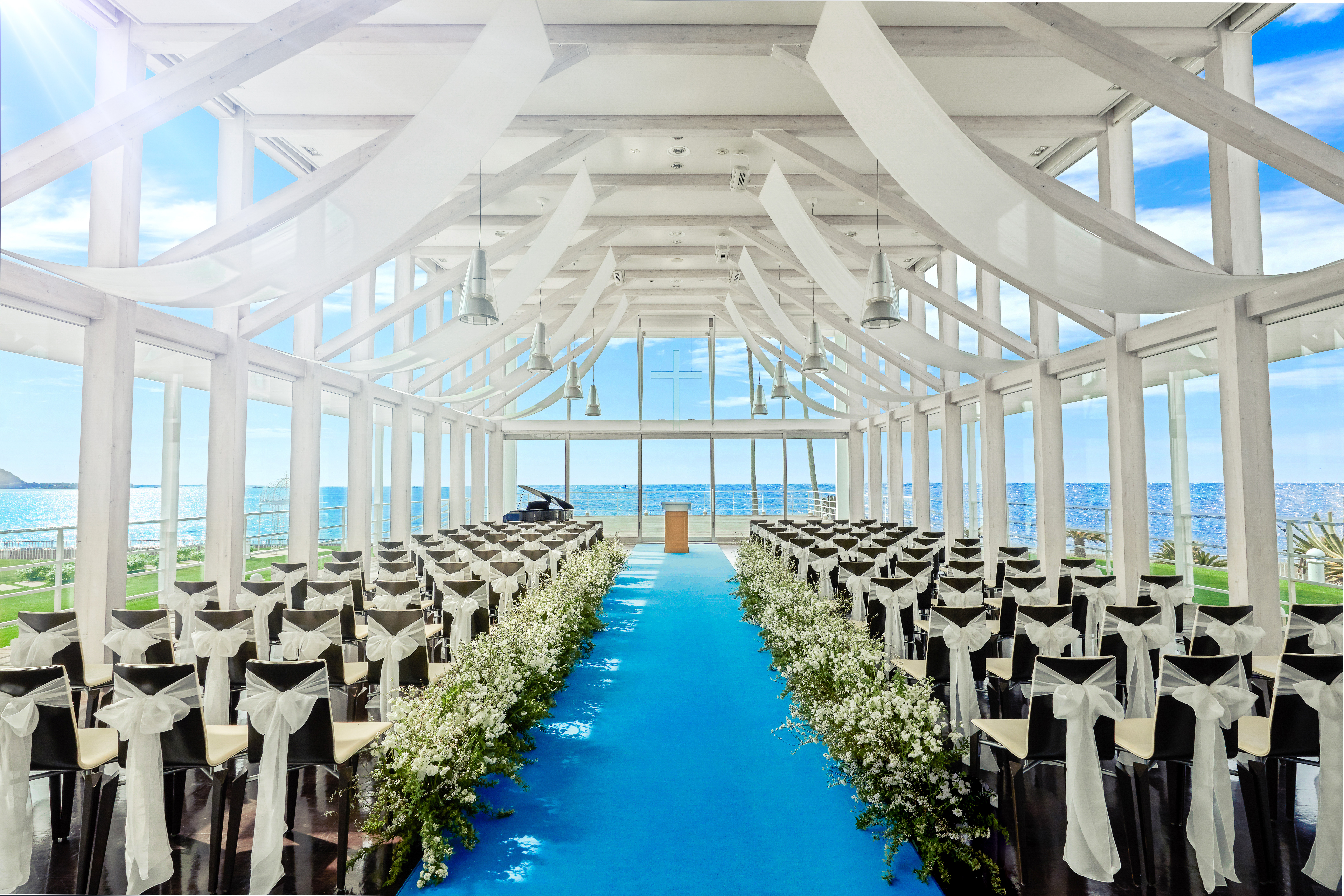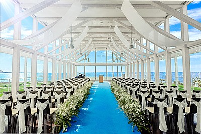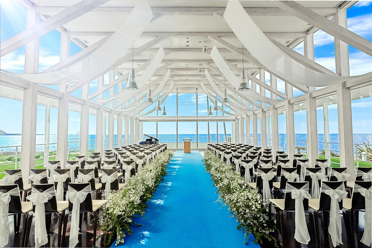 青く輝く海に三方向を囲まれたオーシャンビューの絶景チャペル