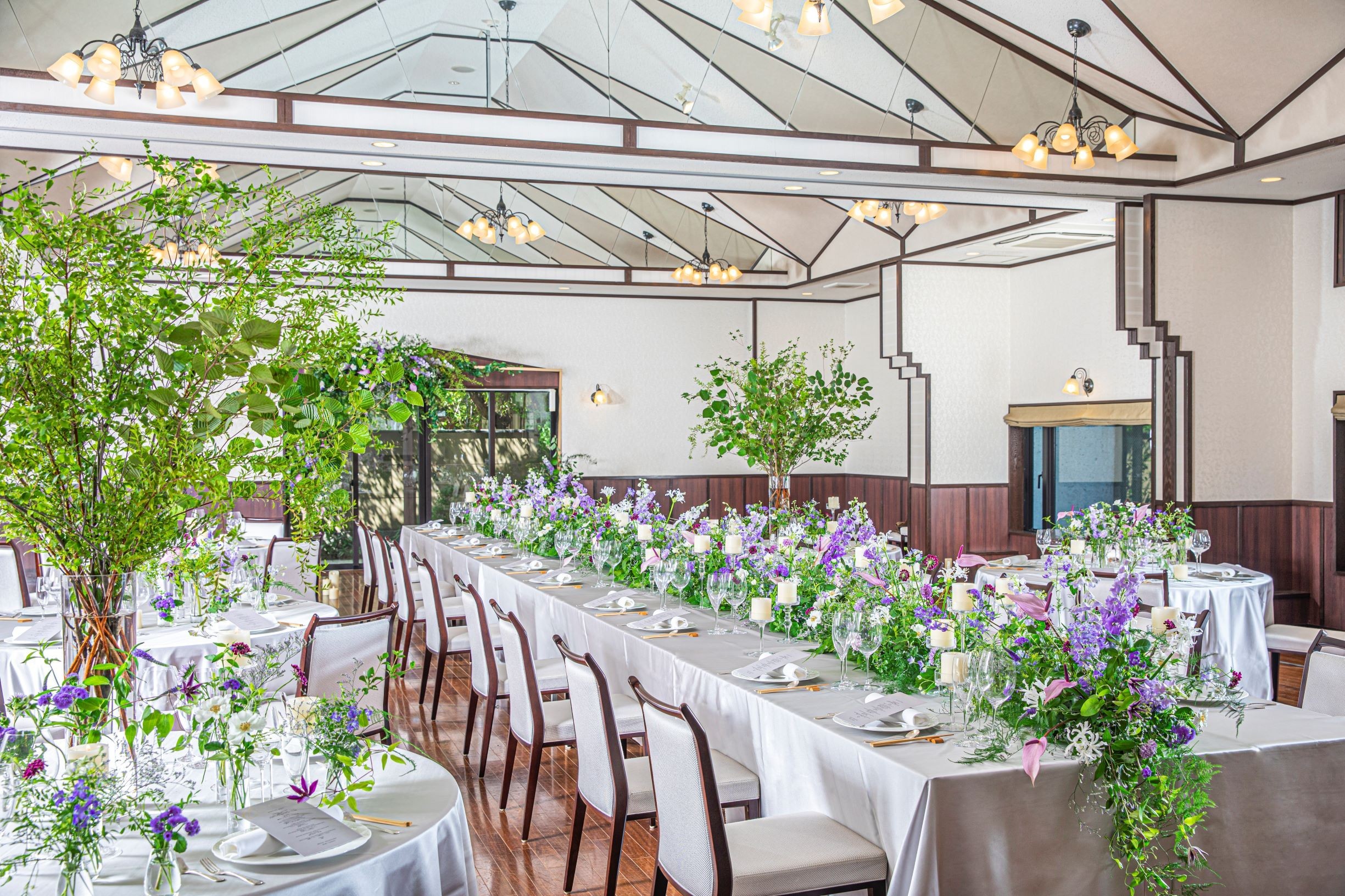 「折鶴」をイメージした天井や滝の流れる窓辺は明るく開放的な雰囲気で、ハレの日を一層華やかに彩ります。窓を開けての換気も可能です。