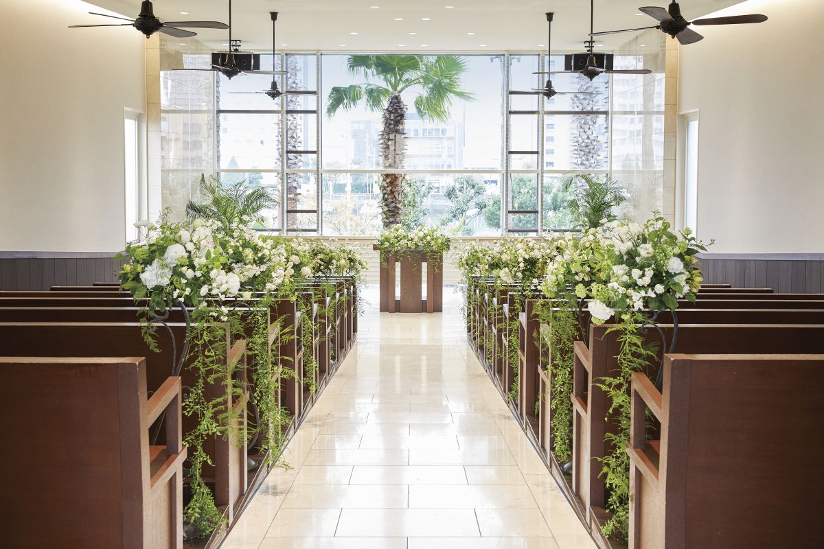 ヴァージンロードが緩やかな傾斜をもつシアター型のチャペルは、どの席からもふたりの姿がよく見えるように工夫して設計されています。天井まで続く大きな窓からは自然光が降り注ぎ、生演奏とコーラスが感動的なセレモニーを演出します。