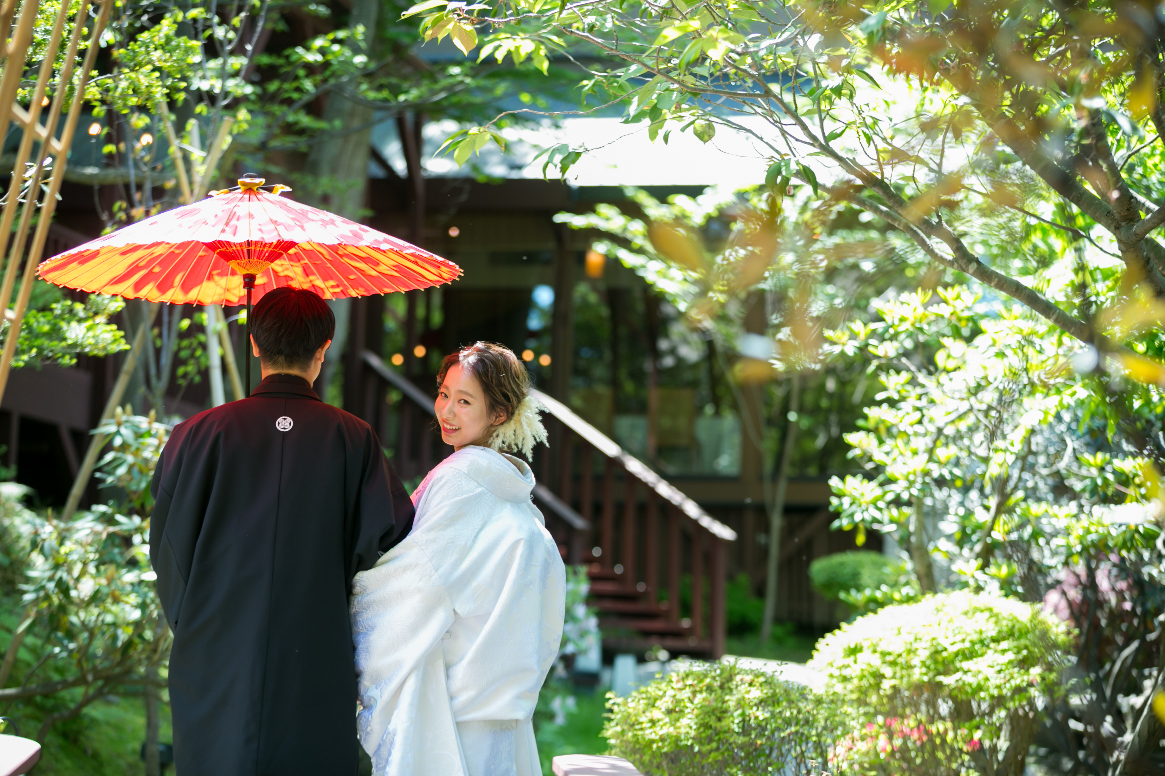 木の温もりと、視界に広がる日本庭園が感動的に演出してくれます。自然光を天然のスポットライトに、お二人の好みの装飾が可能です。