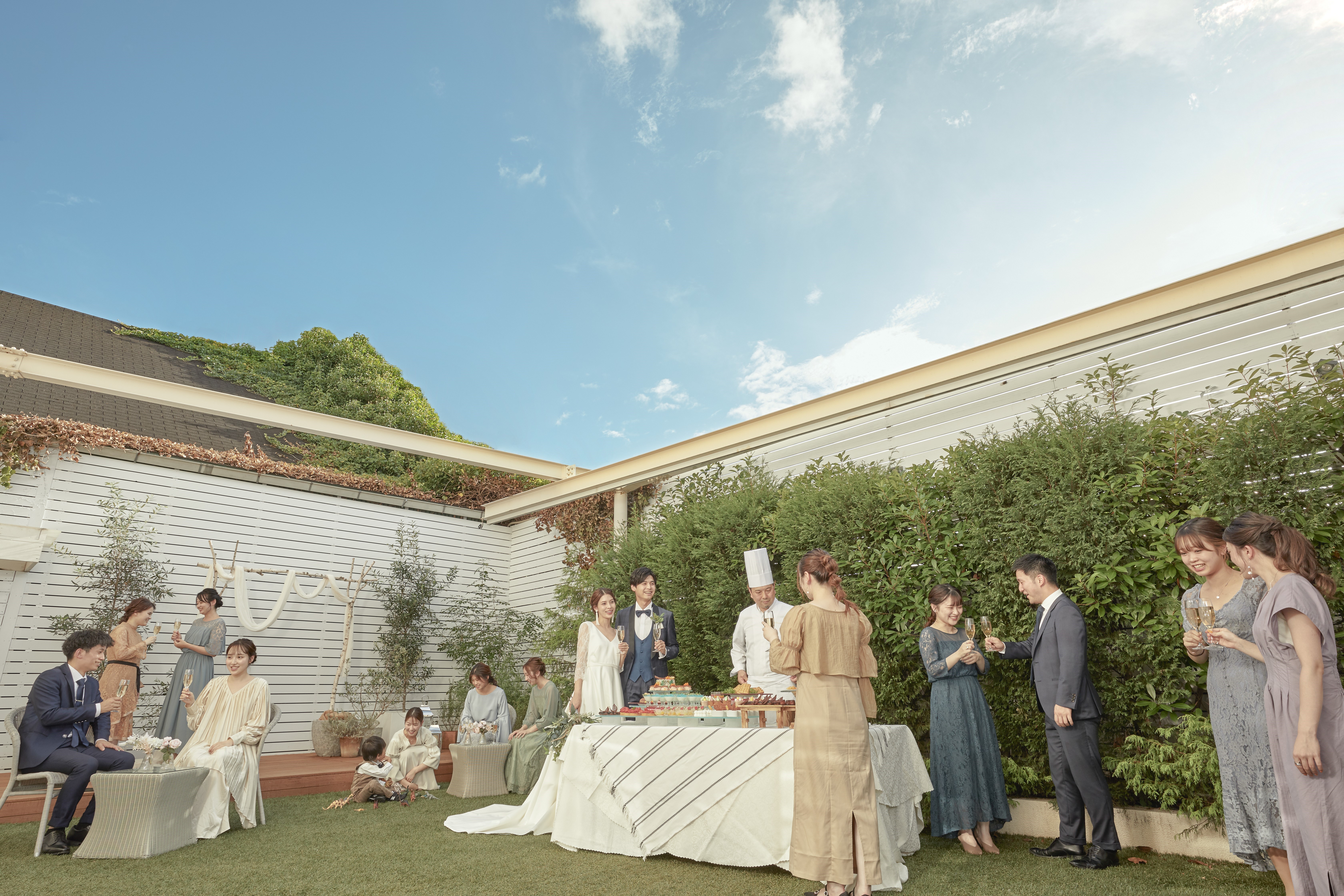 屋外ガーデンでのパーティも可能で、緊張もほぐれ自然と笑顔に