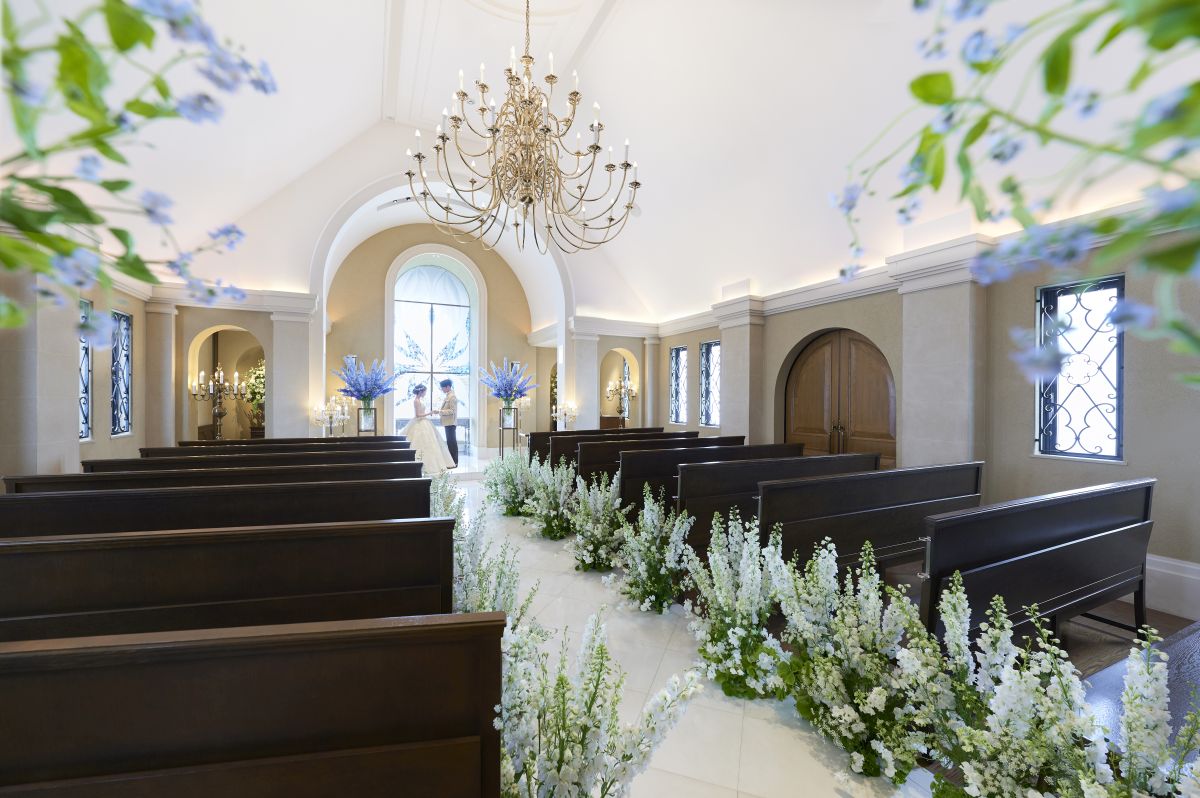 明るい光が差し込み、蝶のステンドグラスが煌く独立型チャペル