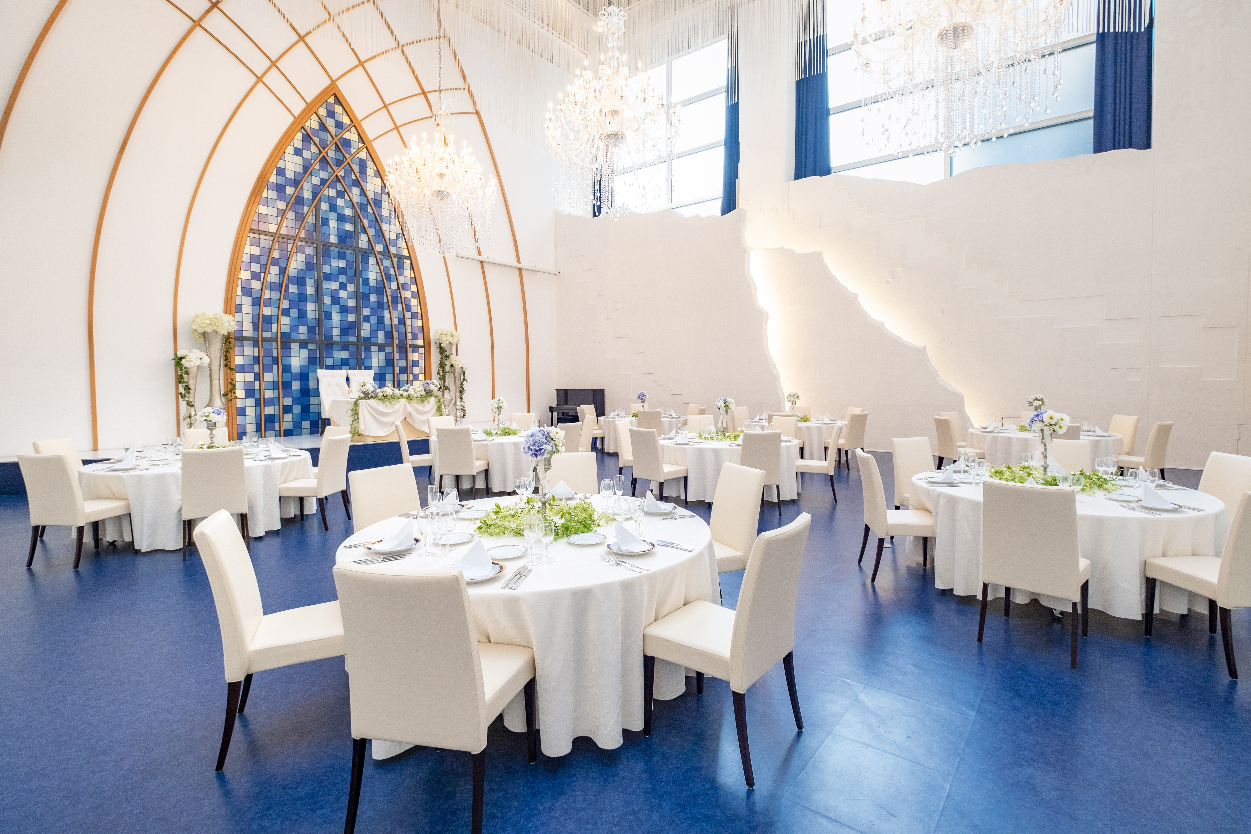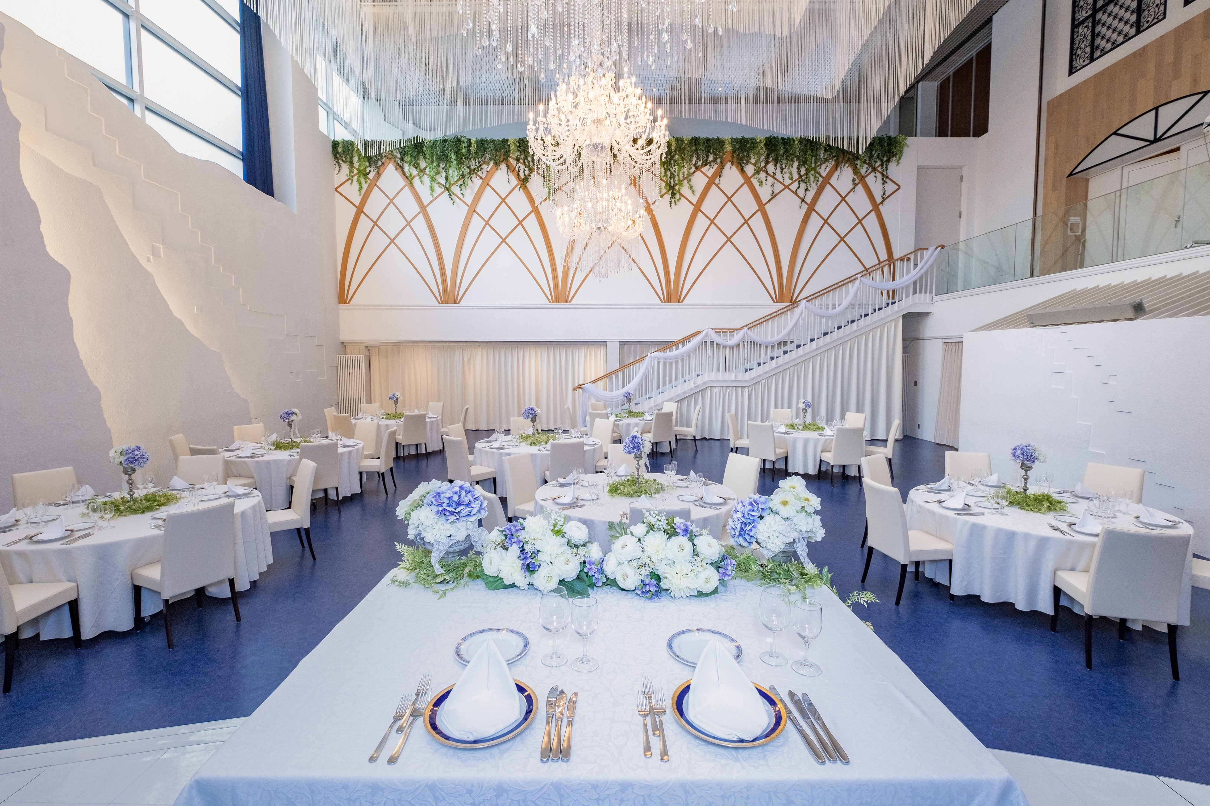 天井高15mの圧倒的な開放感。クリスタルシャンデリアの輝きの中で憧れの大階段入場