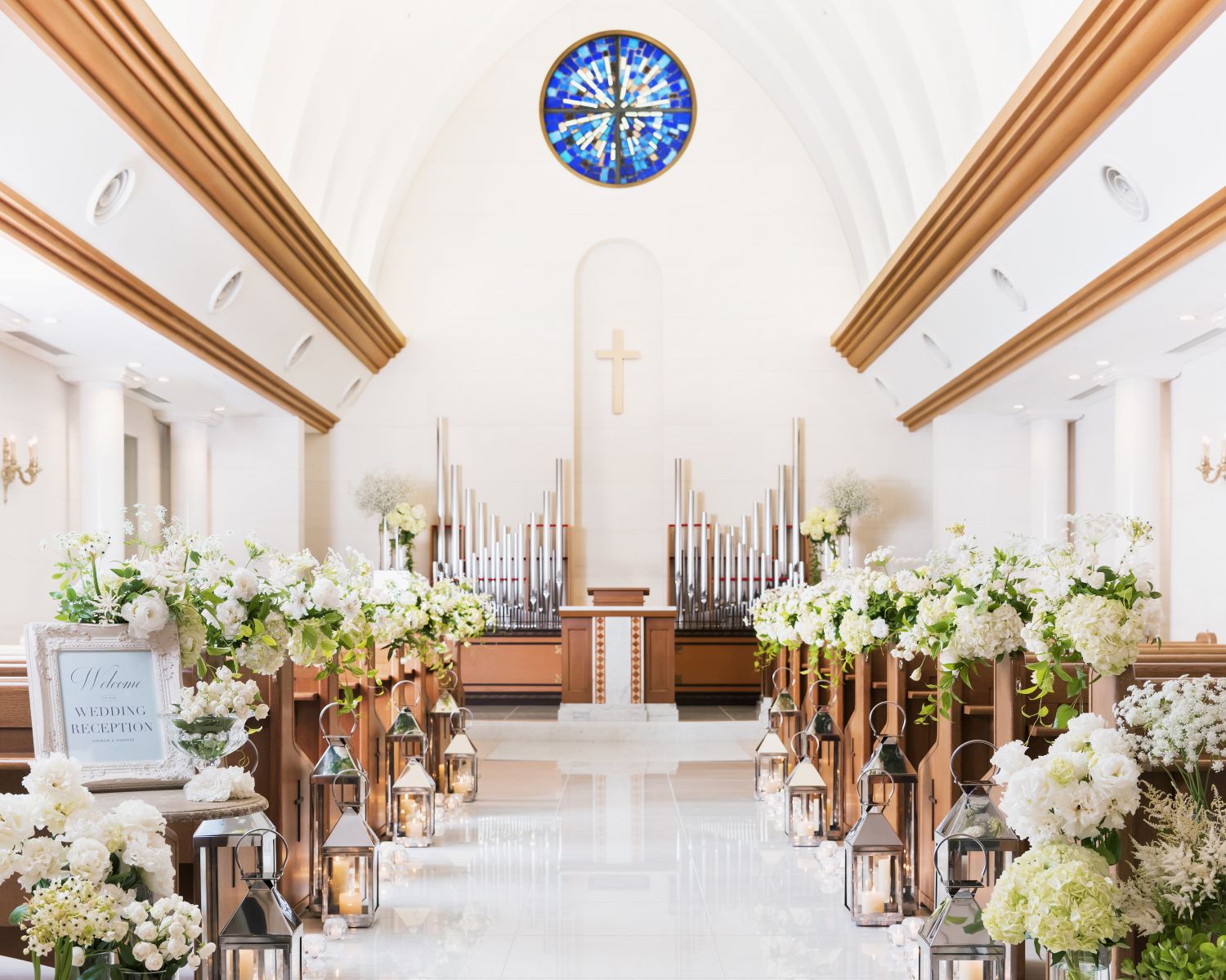 ゆっくりと歩み進むバージンロードは白亜の本大理石。そこに美しい花嫁のシルエットが映り込みます。イタリアのカプリ島にある「青の洞窟」をイメージした「ブルーレジェンド」は、チャペル内が青い光に照らされ神秘的な雰囲気に包まれます。