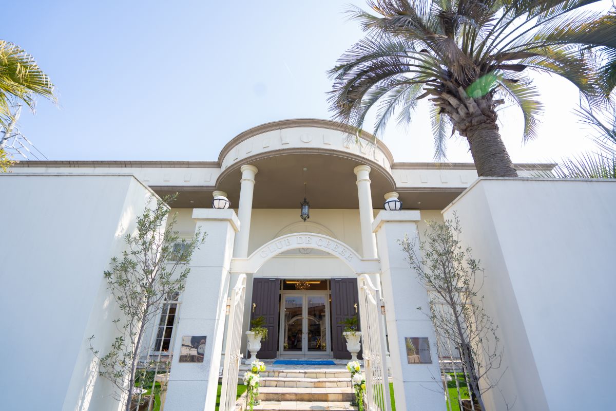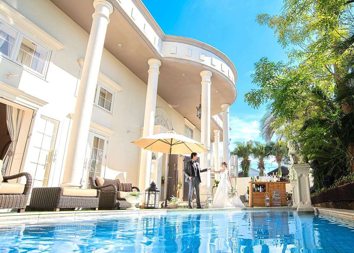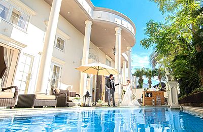 白を基調としたパーティ会場。隣接するプール付ガーデンと一体型になっているため自由度の高い過ごし方ができます。貸切だからこそできるこだわりの演出を。どんなテーマにも合う上質な空間で お二人らしいパーティーが叶います。